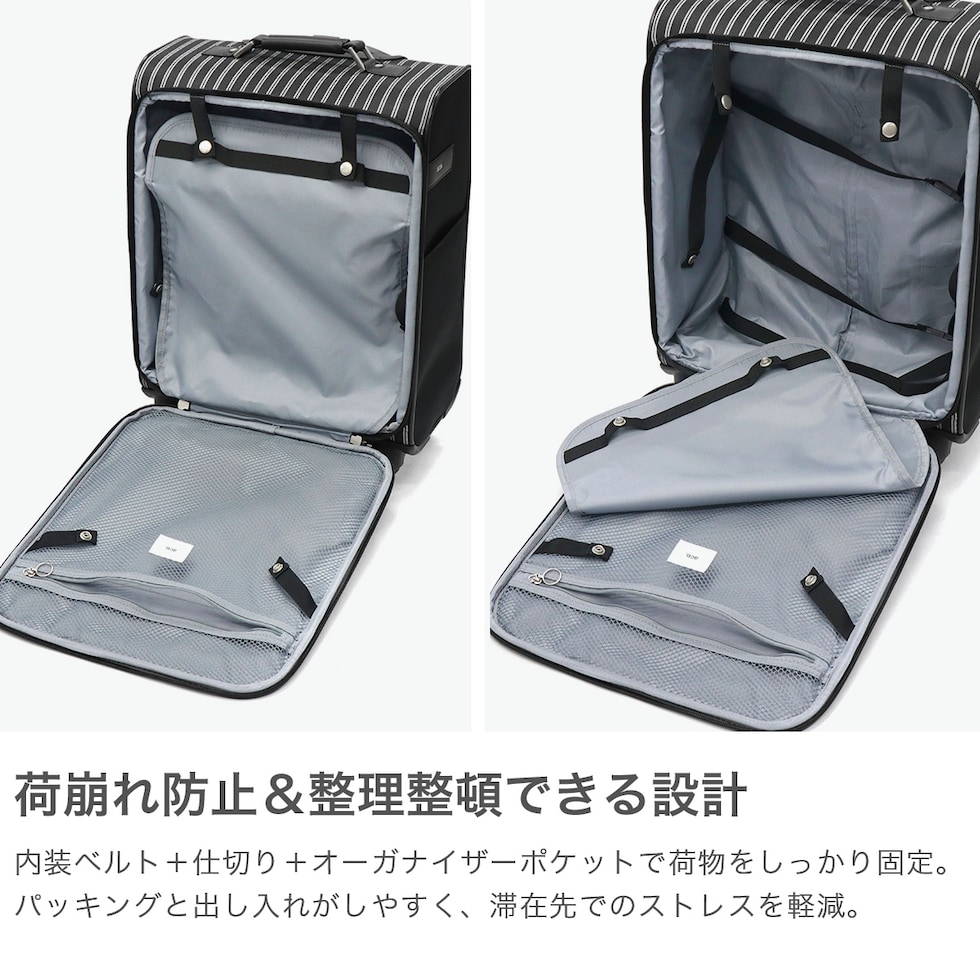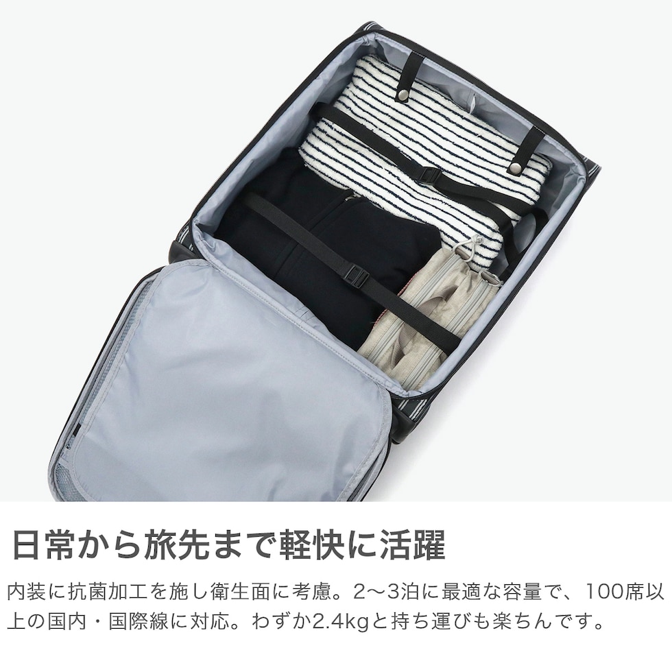 ストレスフリーな旅に 普段使いから2?3泊の旅行まで活躍するソフトキャリー。撥水・抗菌加工を施した生地を使用しており、快適にお使いいただけます。移動中に荷物が取り出せる縦開き仕様や、荷崩れを防ぐ内装ベルトなど、便利な機能が満載。TS南京錠も付属し、セキュリティも安心です。軽量かつコンパクトなサイズ感により、持ち運びや移動がストレスフリーに。スタイリッシュなデザインで、幅広い世代におすすめのアイテムです。 |