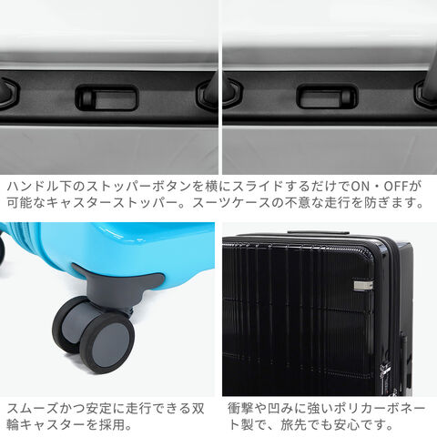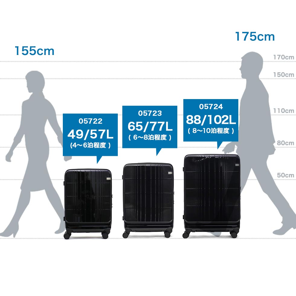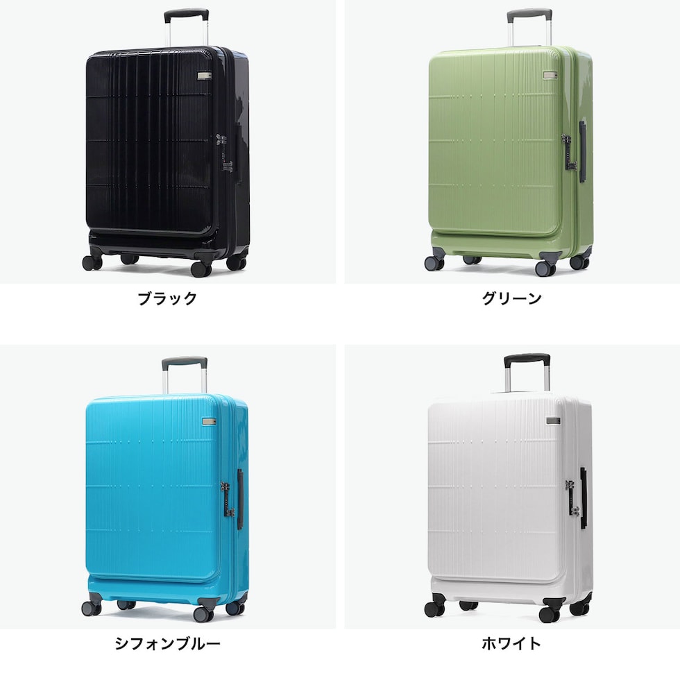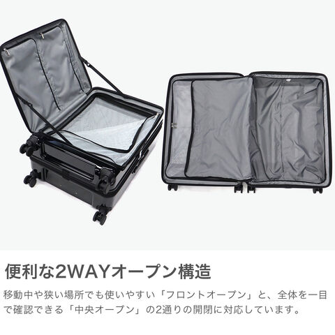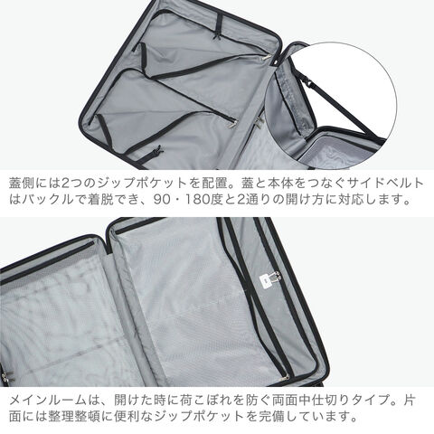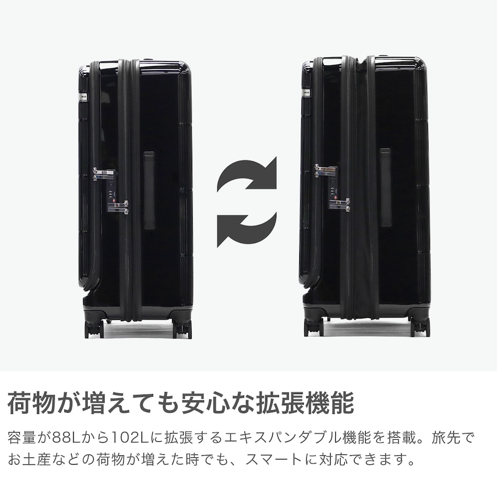 大容量スーツケース フロントオープン・中央ファスナーの2通りの開閉が可能な2WAYオープン式のスーツケース『ディフェレンス』。こちらは、長期滞在向けの88/102L容量を備え、旅先での急な荷物の増加にも対応したエキスパンダブル仕様。ユニセックスでお使いいただけるシンプルなデザインと多彩な機能を盛りだくさんに取り入れ、旅行や出張などを快適にしてくれるアイテムです。 |