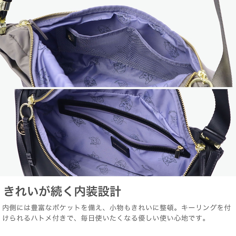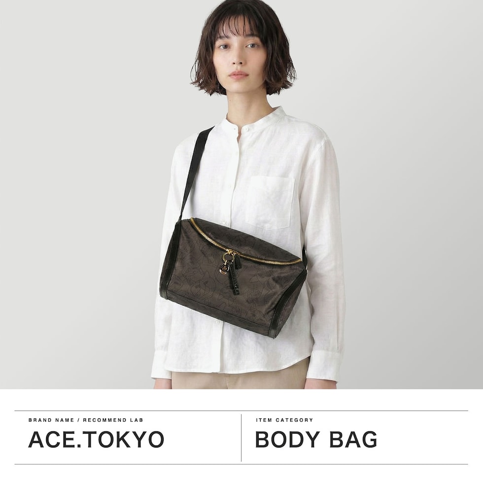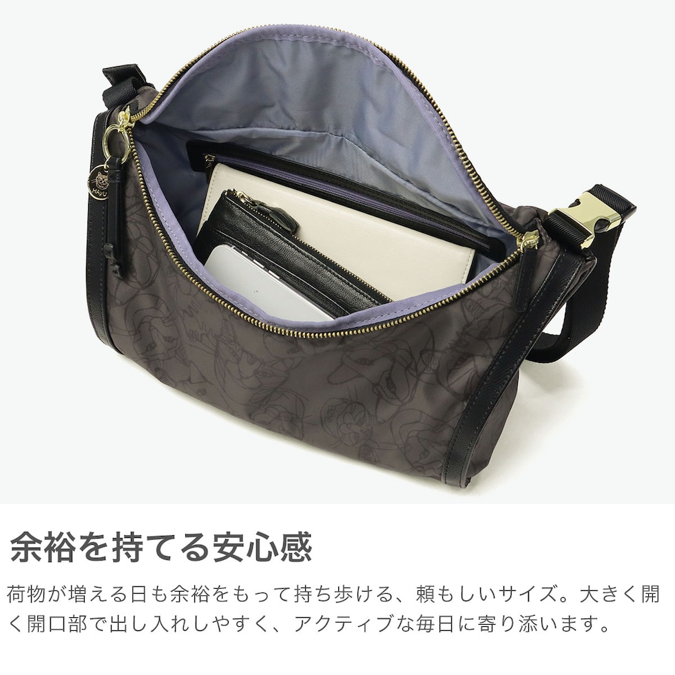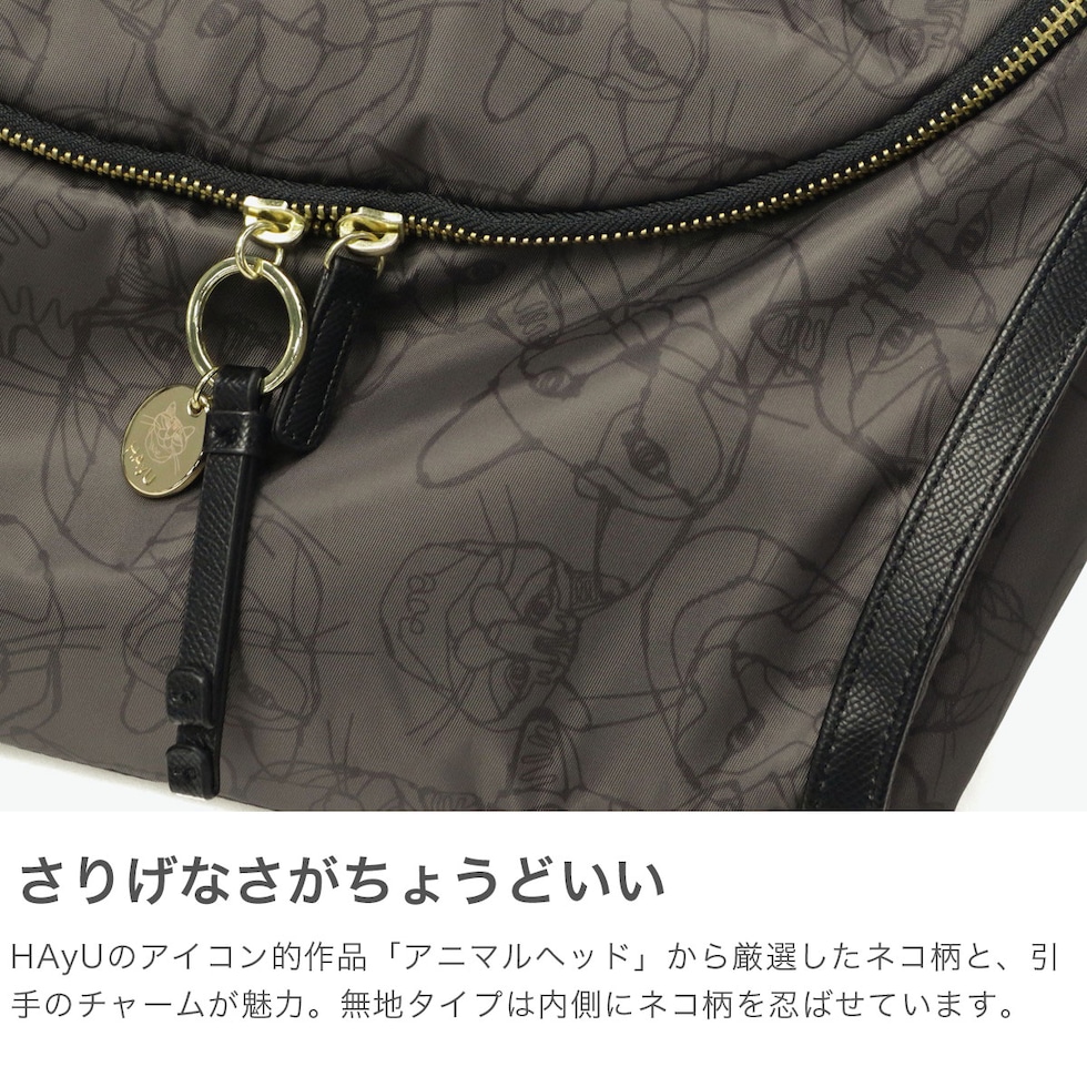 ワイヤーアート作家・小川学さんが手がける「HAyU」と「ace.」がコラボレーションした個性豊かなネコヘッドが描かれた柄が特徴のボディバッグ。開口部はU字型に大きく開き、荷物の出し入れがしやすく使い勝手抜群。着脱をスムーズにしてくれるバックル付きのショルダーストラップなど機能的。ゴールドのロゴ入りチャームがポイントになっており、メイン素材がネコ柄のカラーには無地の内装生地を採用し、メイン素材が無地のカラーには内装生地にネコ柄を取り入れたこだわりの仕上がり。落ち着いたデザインでいろんなスタイルとの合わせやすさも意識し作られたデザインとなっています。