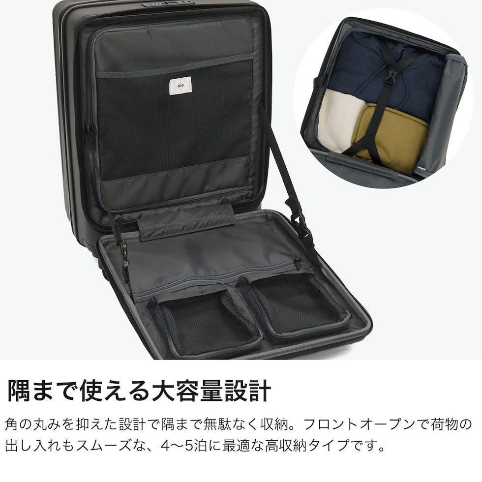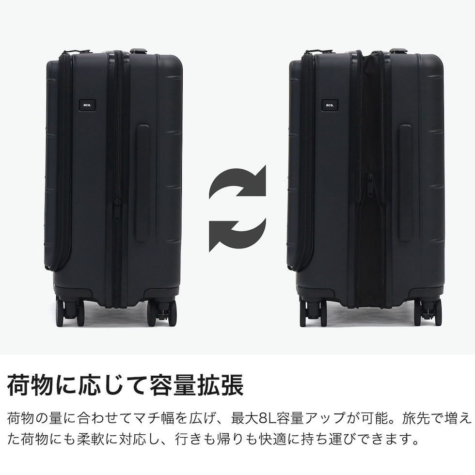 【正規品10年保証】 エーストーキョー スーツケース 機内持ち込み フロントオープン Sサイズ ace.TOKYO 拡張機能付き 拡張 前開き ストッパー ポリカーボネート 小さめ 旅行 41L 49L 4泊 5泊 トレリスZ 09071