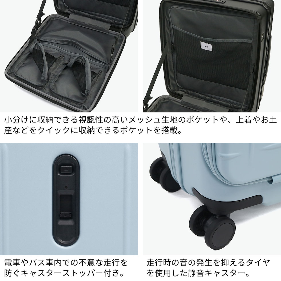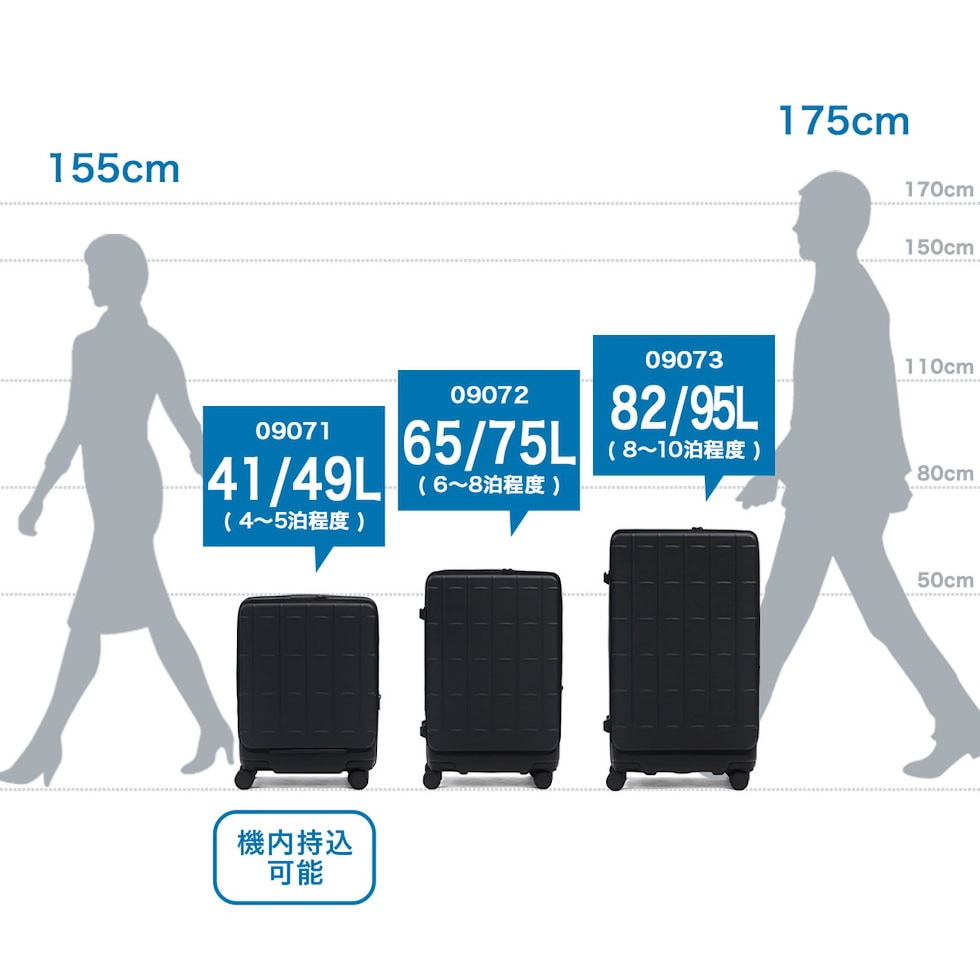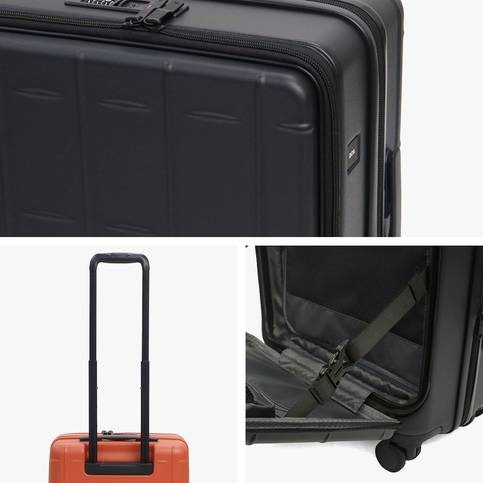 極めた使いやすさ シンプルな格子状のデザインがポイントのフロントオープンタイプの『トレリスZ』のスーツケース。荷物に応じて41/49Lに拡張可能なデザインで、拡張前のサイズでは機内持ち込み対応サイズとなっており、国際線、国内線100席以上の航空機に対応。不意な走行を防ぐキャスターストッパーや、走行時も快適な静音キャスターを装備。内装スペースを有効活用でき荷物が収納しやすいフロントオープン仕様で、個人でもファミリーでも使い勝手の良いアイテムです。 |