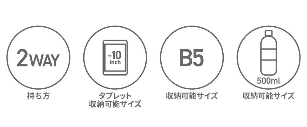 | 仕様 | <外側> ジップポケット(M)×1 ジップポケット(S)×1 ポケット(S)×1 <内側> タブレット収納×1 ジップポケット(L)×1 ポケット(L)×1 <付属品> ショルダーストラップ×1 |
