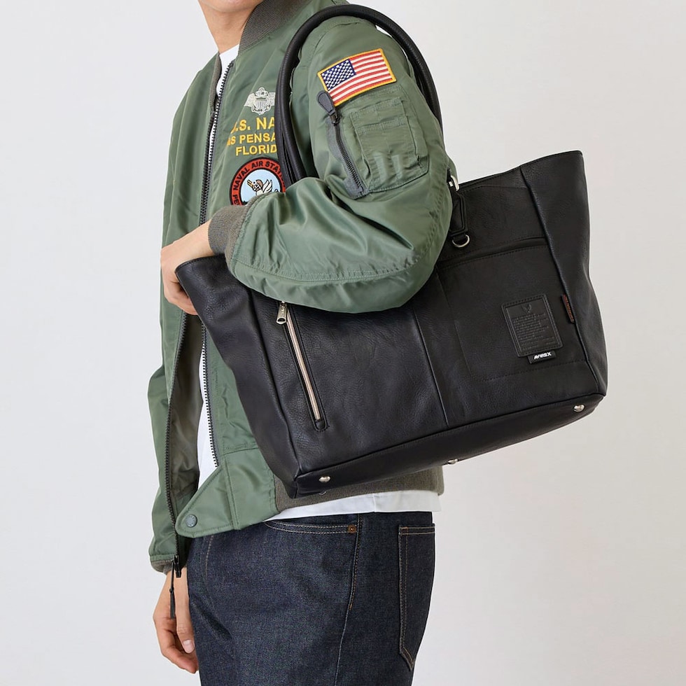 ミリタリー感じる 大人に似合う仕上り 厚みのあるPU合皮を使用した「STUART」シリーズのトートバッグ。ネーム部分にミリタリーのライナーネームモチーフを採用した、AVIREXらしいデザインがポイントです。使い勝手の良いサイズ感とどんなコーデにも馴染むカラーリングで、普段使いからビジネスカジュアルまで活躍するアイテムとなっています。 |