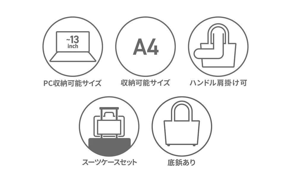 | 仕様 | <外側> ジップポケット(L)×1 ジップポケット(L)×1 └ 内蔵 ポケット(S)×2 ペンホルダー×2 ジップポケット(S)×1 ポケット(S)×1 <内側> PC収納×1 ジップポケット(S)×1 ジップポケット(M)×1 |