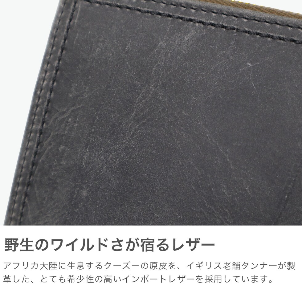 唯一無二の仕上がり ハードな質感のクーズーレザーを使用した『KUDU シリーズ』のコンパクトウォレット。アフリカ大陸に生息するクーズーの原皮を使用し、野生に生きた証としてのキズやシワなどが無数にあるのが特徴的。製品によっては大きな個体差が現れる革ですが、ワイルドさ宿るその見た目によってオリジナルの表情をお楽しみいただけます。さらに、ワックス加工を施すことにより、経年変化によるツヤが出て更なる深みが増し、唯一無二の仕上がりとなっています。 |