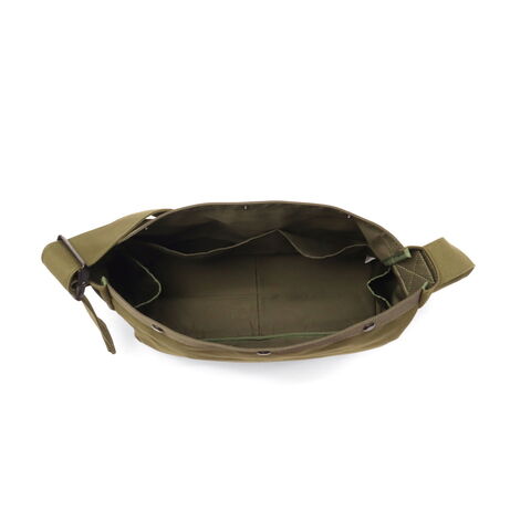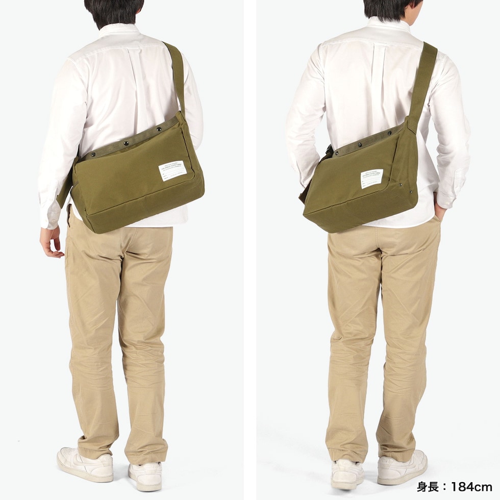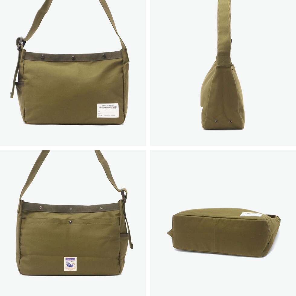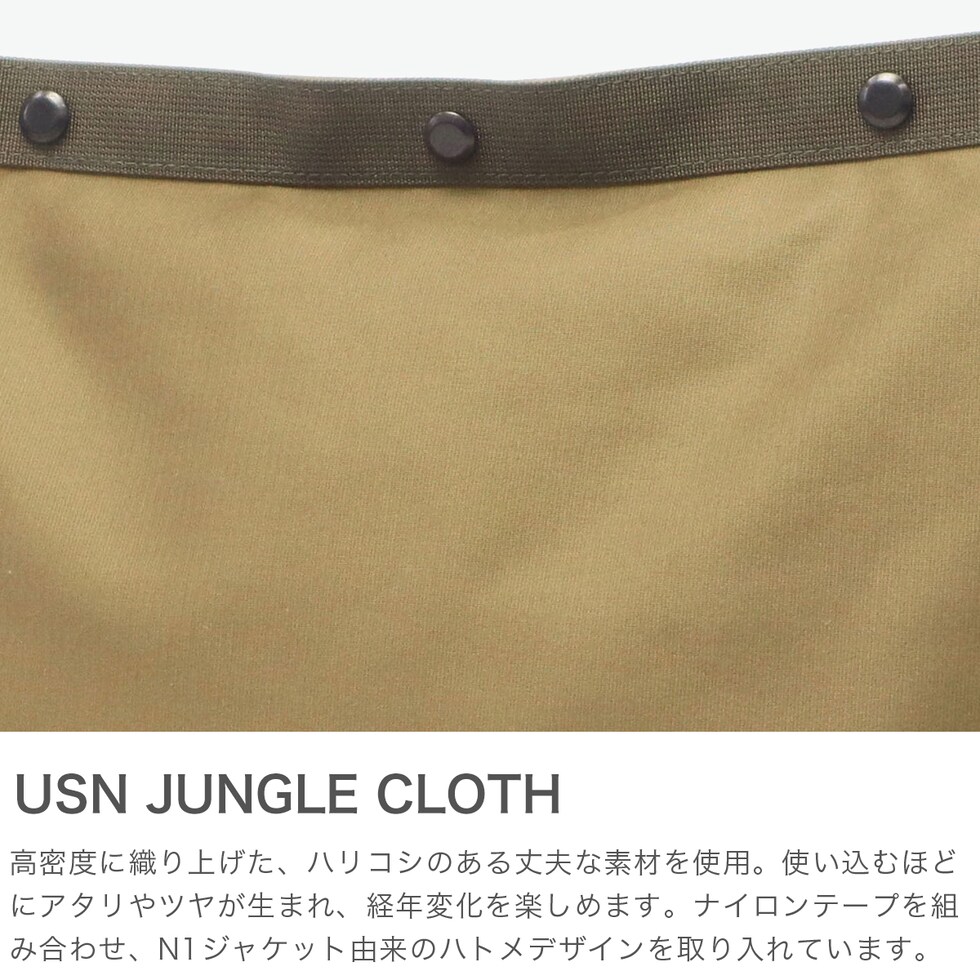 タフな仕上がり アメリカ海軍 N-1デッキジャケットに使用されていたジャングルクロスを古着から徹底的に分析し、当時と変わらない風合いを完全に再現した『USN JUNGLE CLOTH』シリーズのショルダーバッグ。ハリとコシがあり耐久性も備えた生地の、タフで無骨な雰囲気が魅力です。B4サイズをぴったり収納できる大きめサイズで、通学バッグにもおすすめ。開口部もボタン留めで安心の作りです。 |