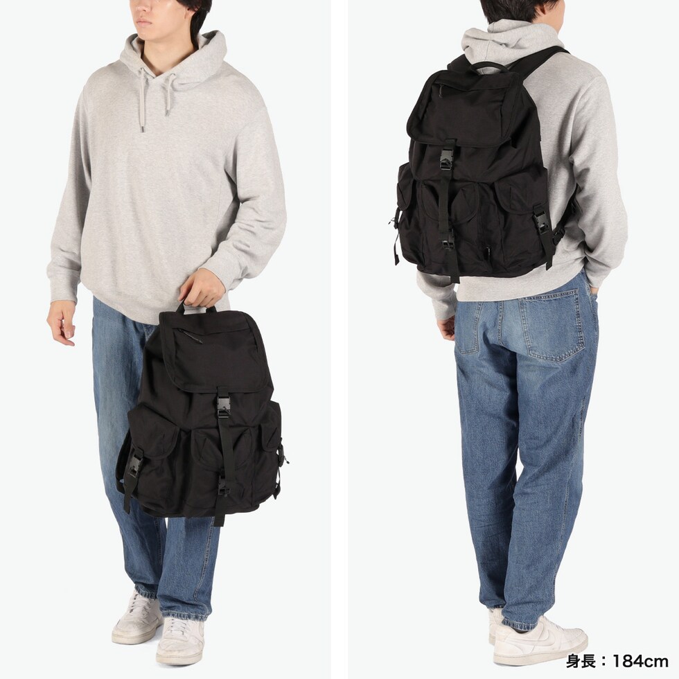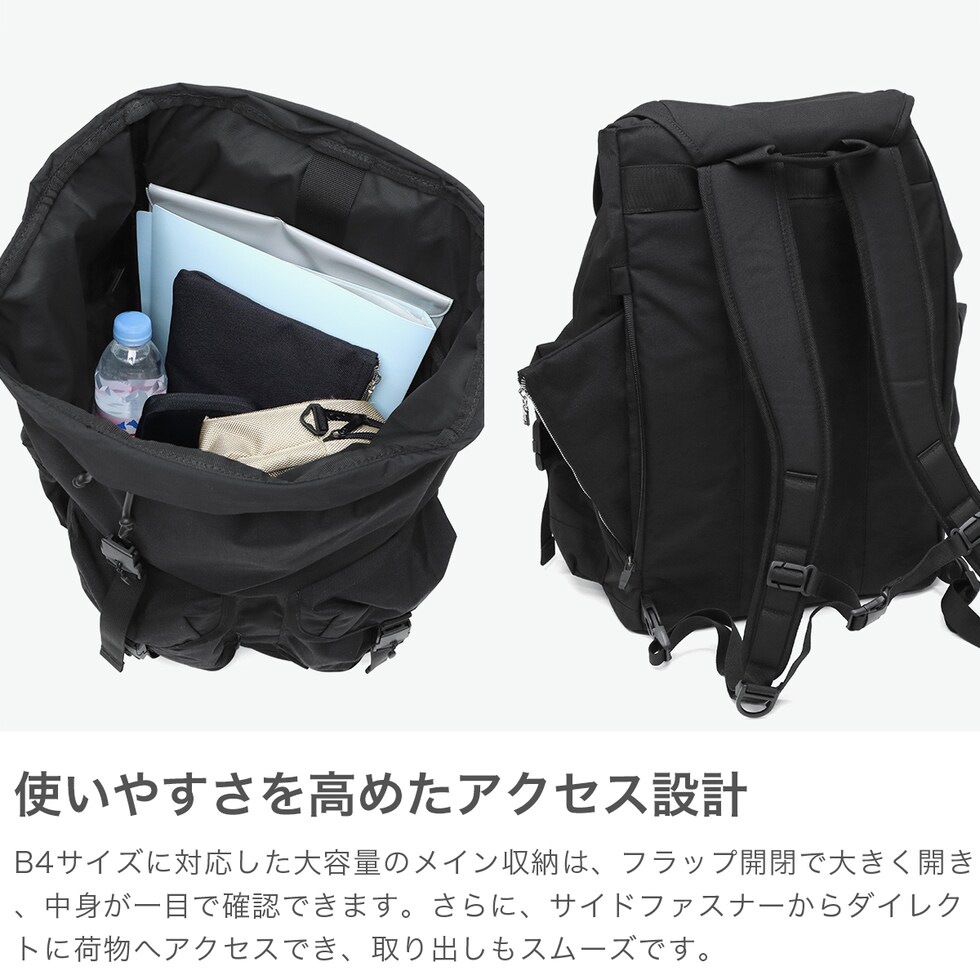 洗練されたルックス シンプルで洗練されたデザインの大容量バックパック。フラップ開閉式で、サイドからはダイレクトに中の物を取り出せるファスナーを設けることで、使いやすい設計となっています。背面には芯材を入れないことで、体にフィットするように作られた柔らかい仕上りに。普段使いにぴったりのカジュアルなアイテムとなっています。 |