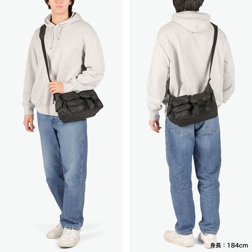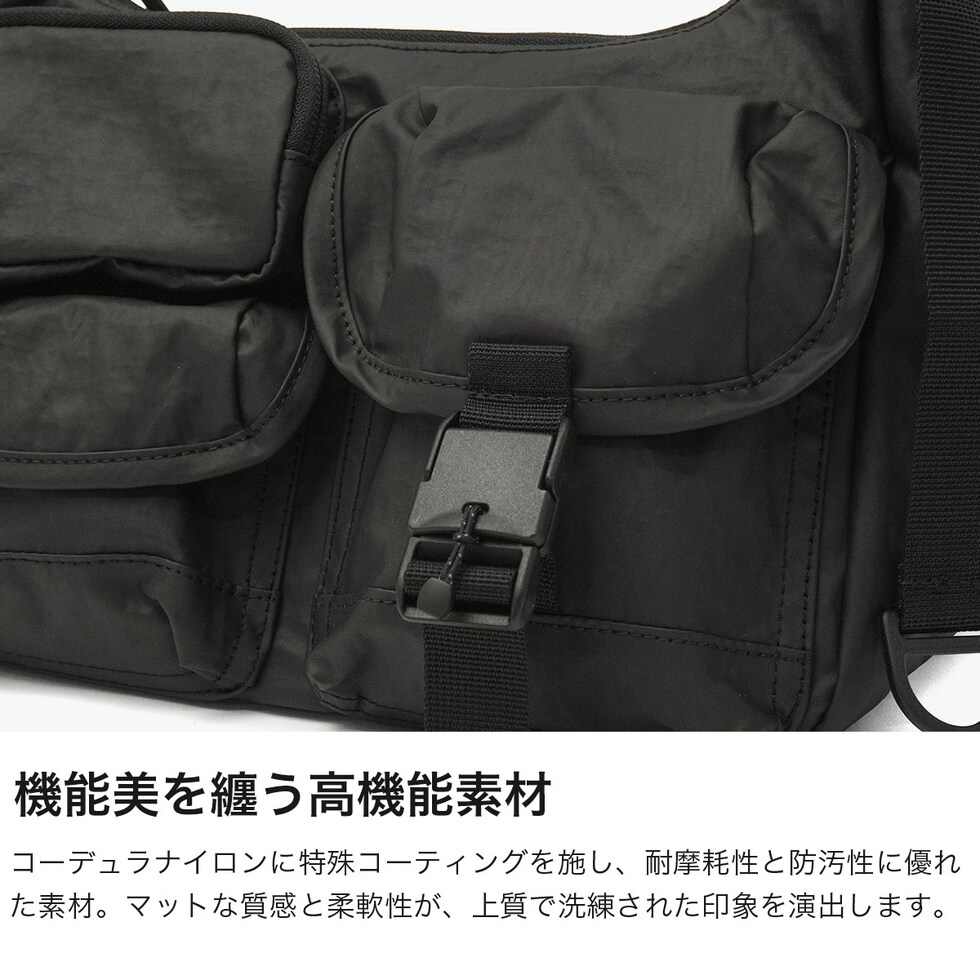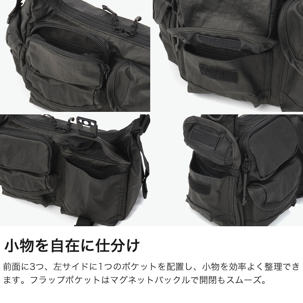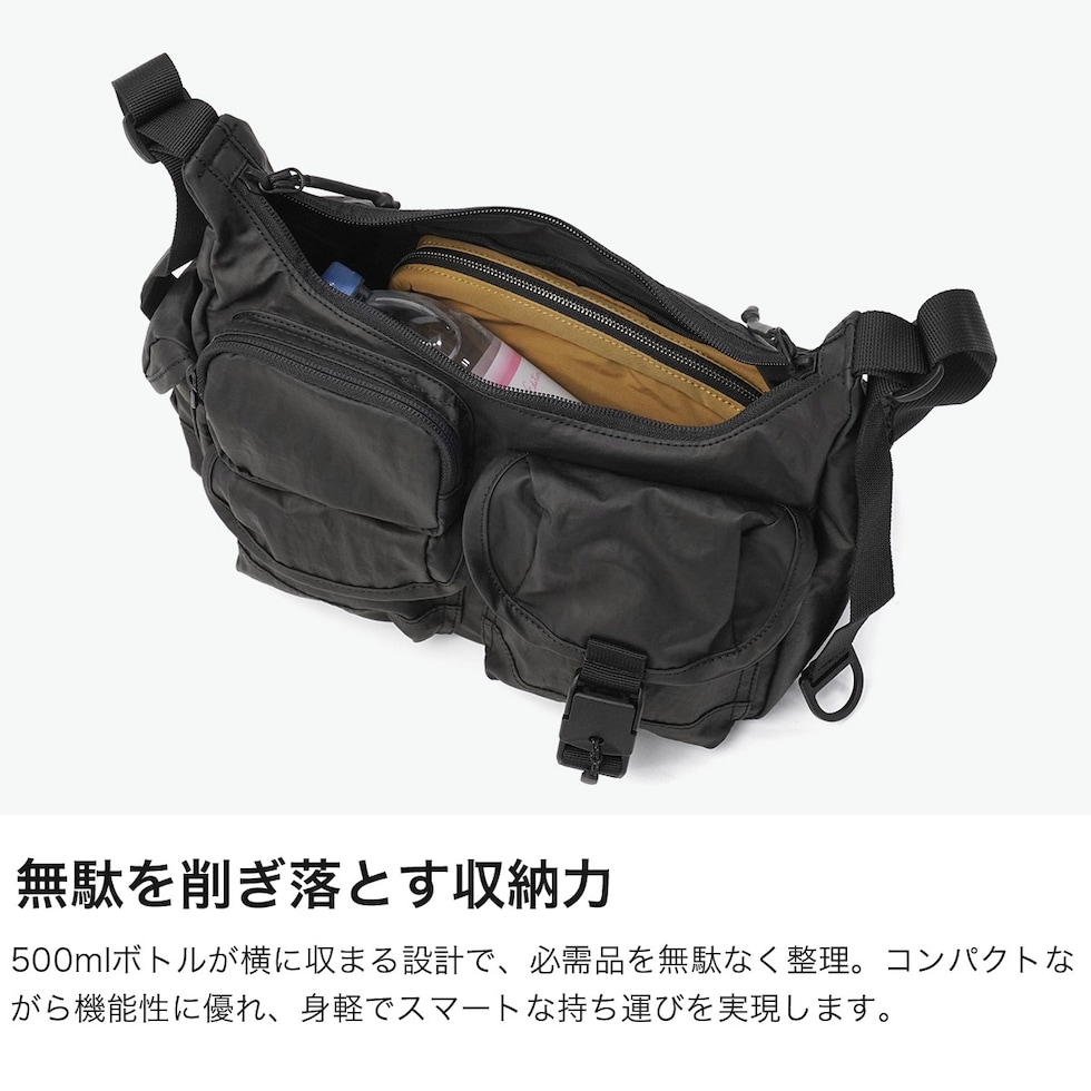 | 整理しやすい快適設計 街も自然も自由に行く フロントに異なる形状の3種類のポケットを備えた、印象的なデザインの小型ショルダーバッグ。A5サイズ対応の使いやすい横型フォルムに加え、複数のポケットを配置することで小物の整理もスムーズに行えます。耐磨耗性・耐汚染性に優れたPUコーティングされたコーデュラナイロンツイルを使用し、裏面にはAIR TIGHTNESS加工を施して水の侵入を防止。多機能で毎日の使用に便利な、アクティブシーンにぴったりのバッグです。 |