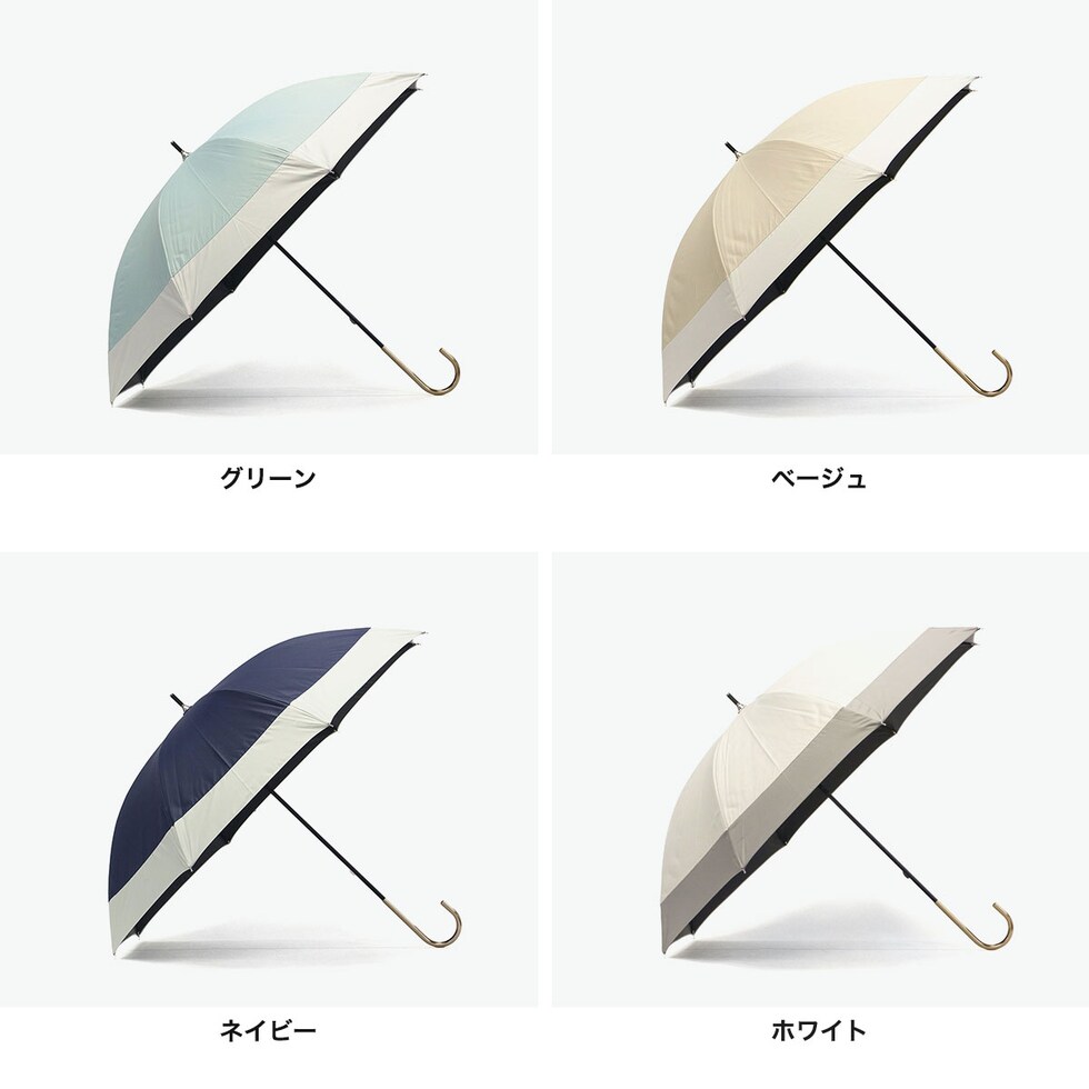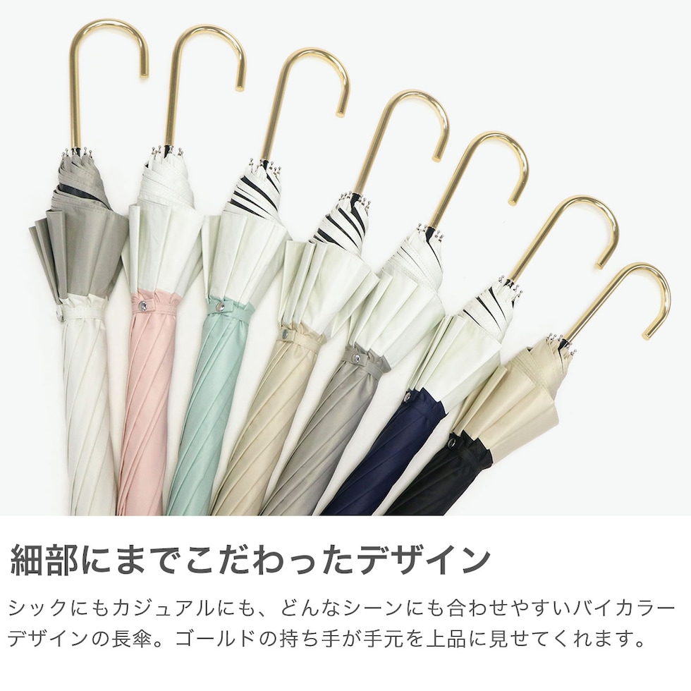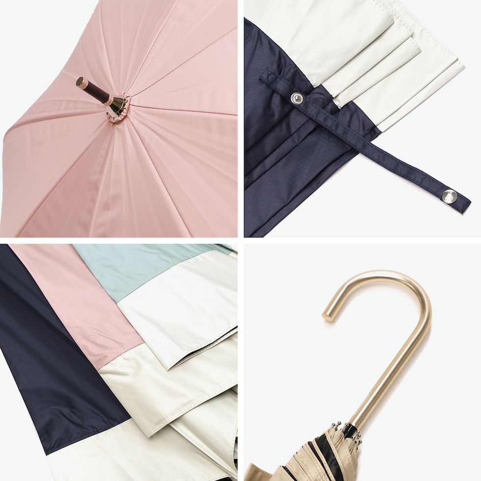 品のあるバイカラー傘 シックにもカジュアルにも、どんなコーディネートにも馴染むバイカラーの晴雨兼用傘。UVカット率・遮光率ともに99.9%以上を実現し、気になる紫外線をしっかりカットしてくれます。裏面はPU加工を施すことで、地面からの照り返しによる日焼けも防止。淡いカラーでも雨や日差しから守ってくれる頼もしい傘です。 |