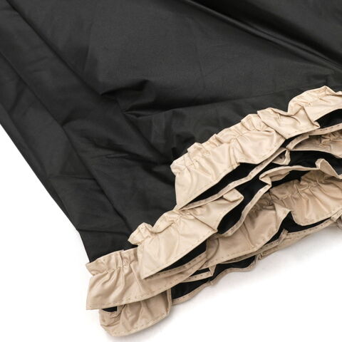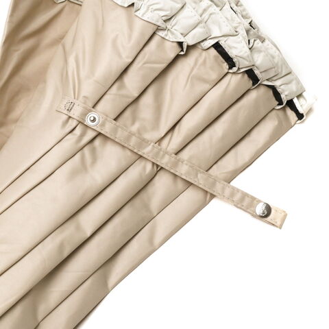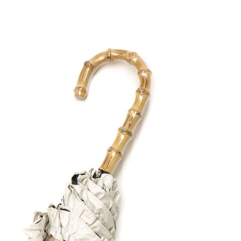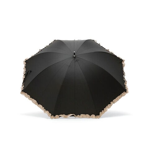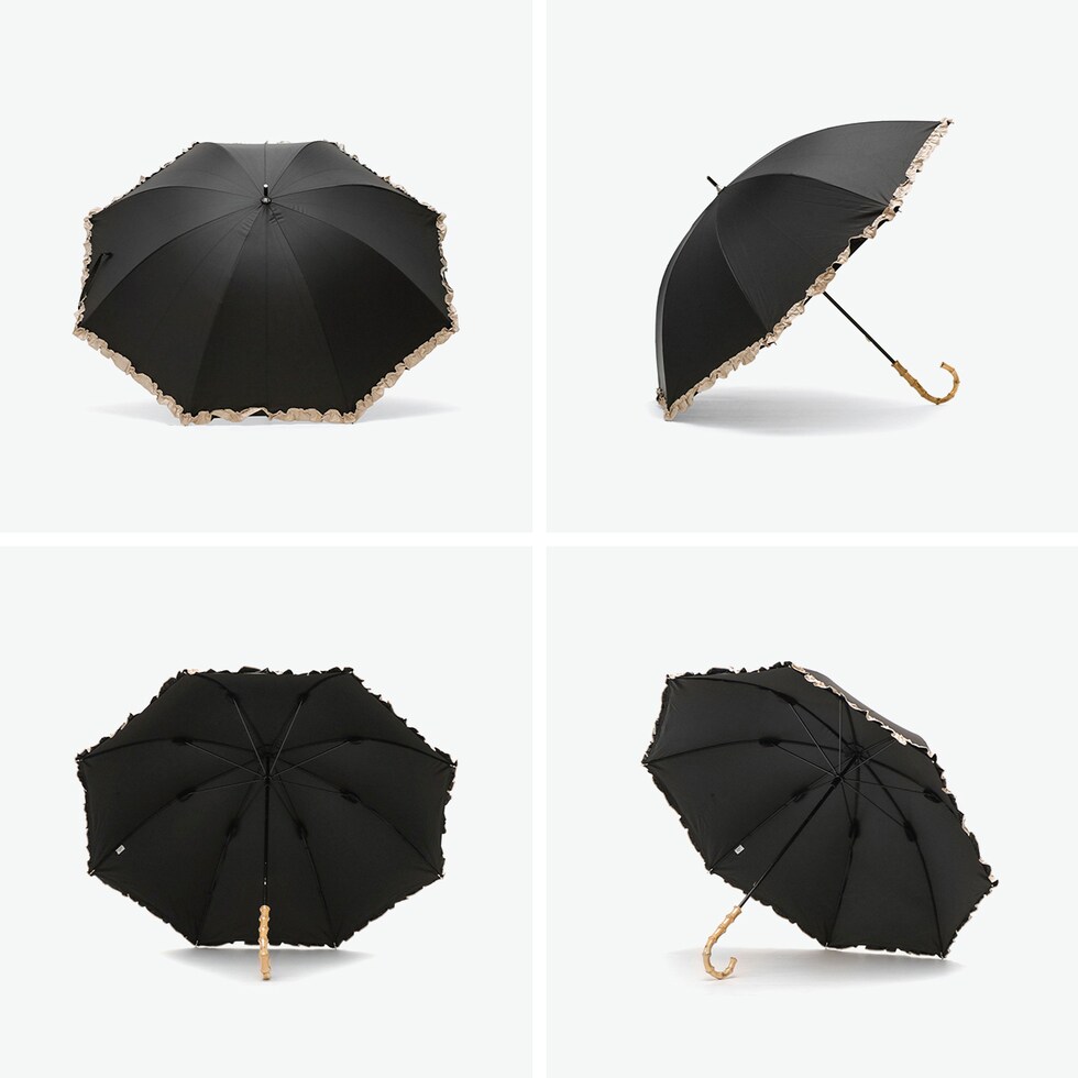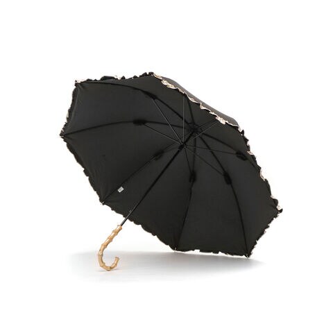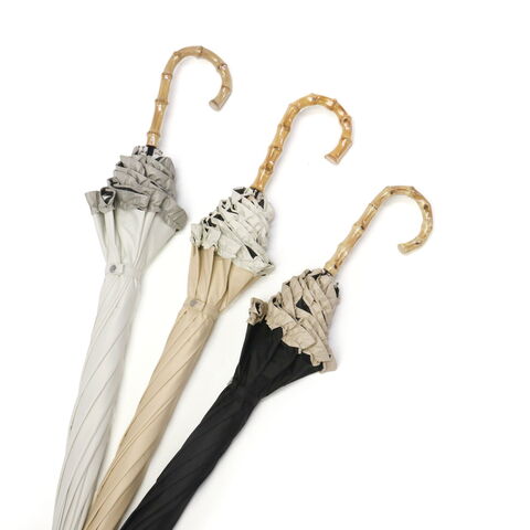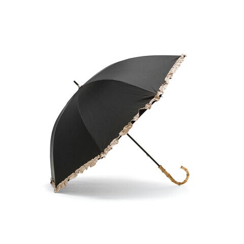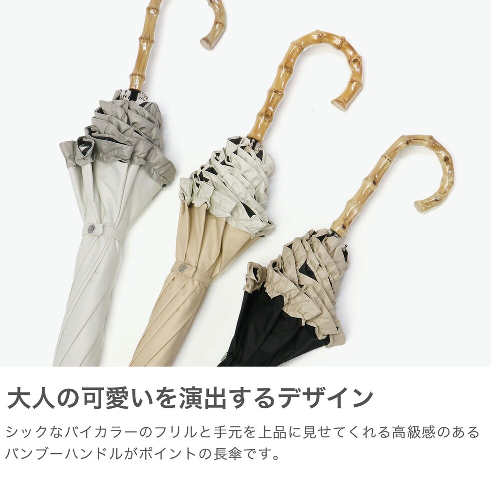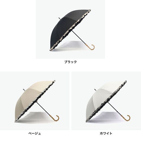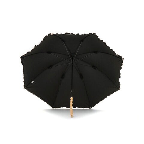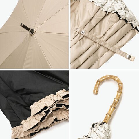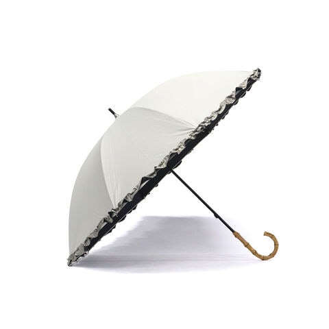 バイカラー晴雨兼用傘 上品で可愛らしいフリルがデザインされた晴雨兼用長傘。本体はUVカット率99.9%以上を備えており、高い遮光と遮熱性に優れています。裏面には黒のPUコーティング加工が施されているため、地面からの照り返しによる日焼けも防ぎます。バンブーのハンドルとバイカラーのフリルがポイントです。 |