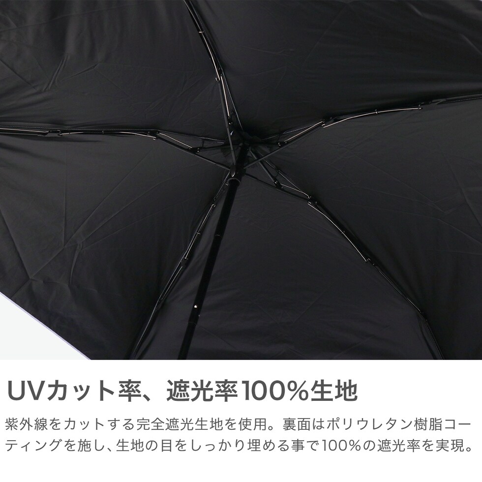 UVカットで日差し対策 170gの軽量設計で持ち運びに便利折りたたみ傘。晴雨兼用で急な雨や日差し対策に活躍します。内側は黒でしっかり遮光&遮熱効果を発揮。親骨50cmで程よいサイズ感ながら、コンパクトに収納可能です。 |