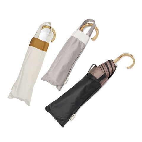 上品に彩る晴雨兼用傘 グログランテープと高級感のあるバンブーハンドルが上品さを演出してくれる晴雨兼用の折りたたみ傘です。UVカット率100%の完全遮光生地を使用し、裏面にはPUコーティング加工を施す事で100%の遮光率を実現。デザインと機能性を兼ね備えた1本で、晴れの日も雨の日もエレガントに彩ります。 |