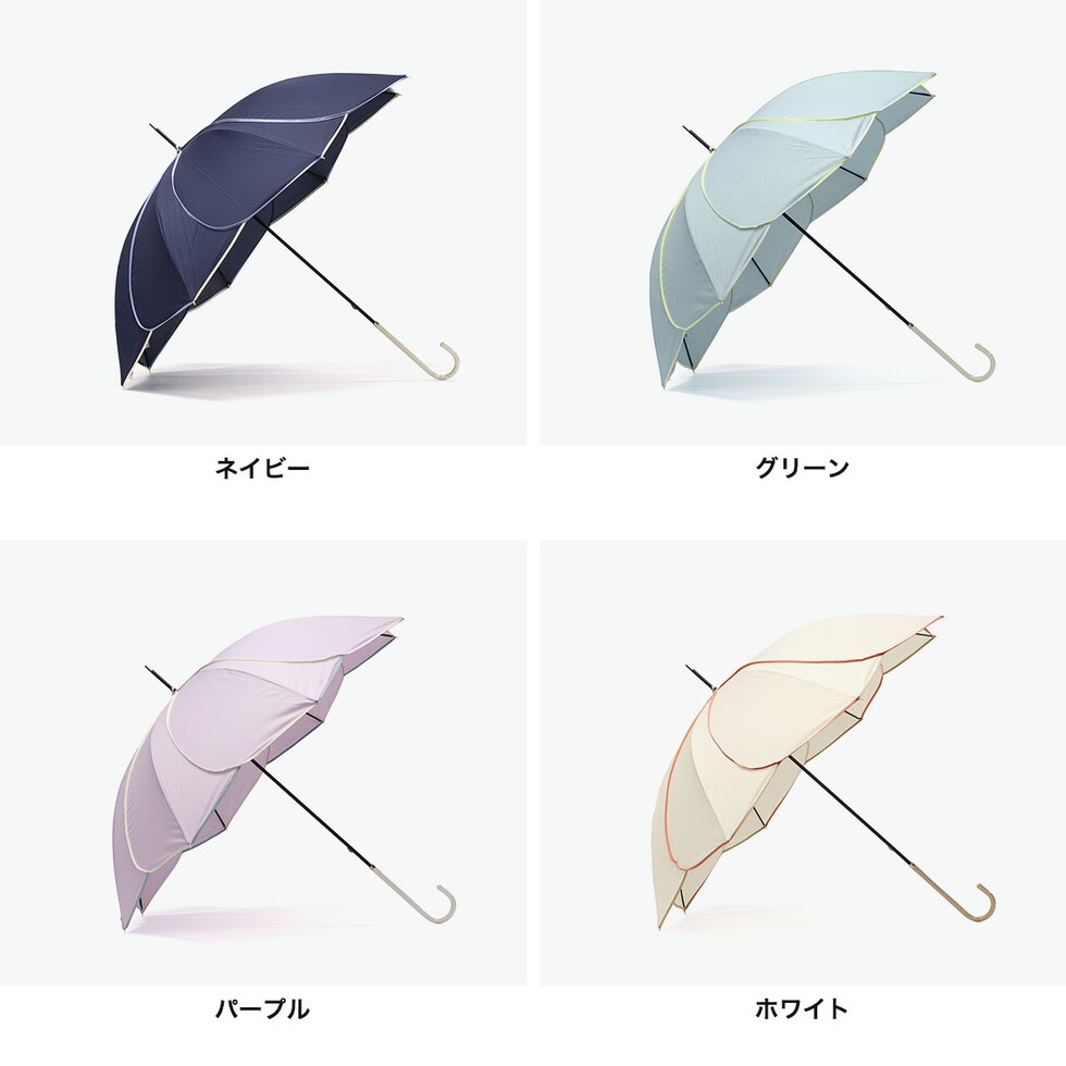 上品で可憐な長傘 パッと傘を開くと花びらのようなシルエットが美しい長傘。晴雨兼用なので雨の日も紫外線が強い日も活躍!花弁が折り重なったようなデザインは、女性らしい可憐な印象を与えます。 |