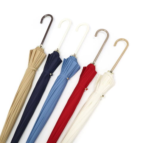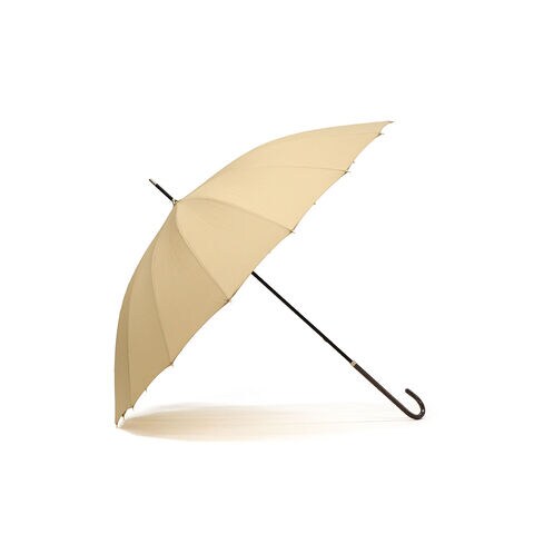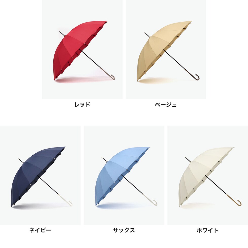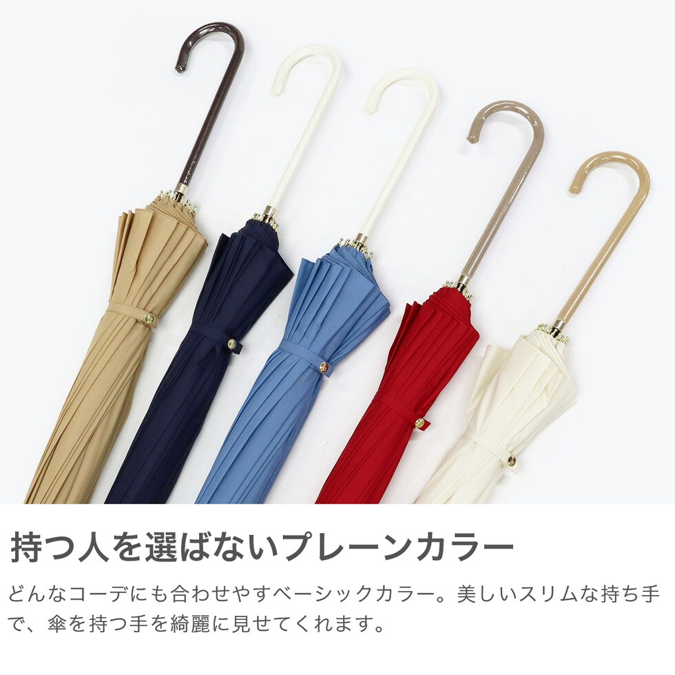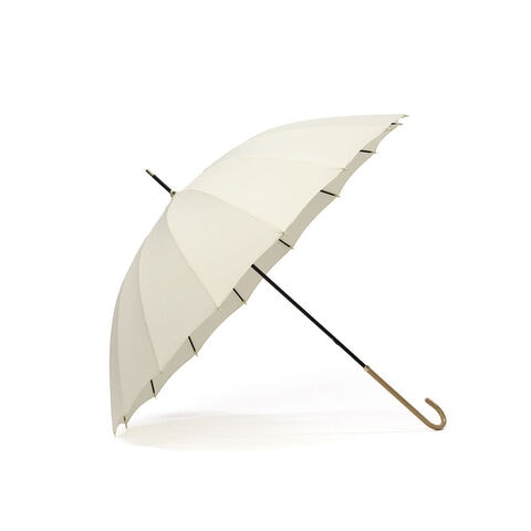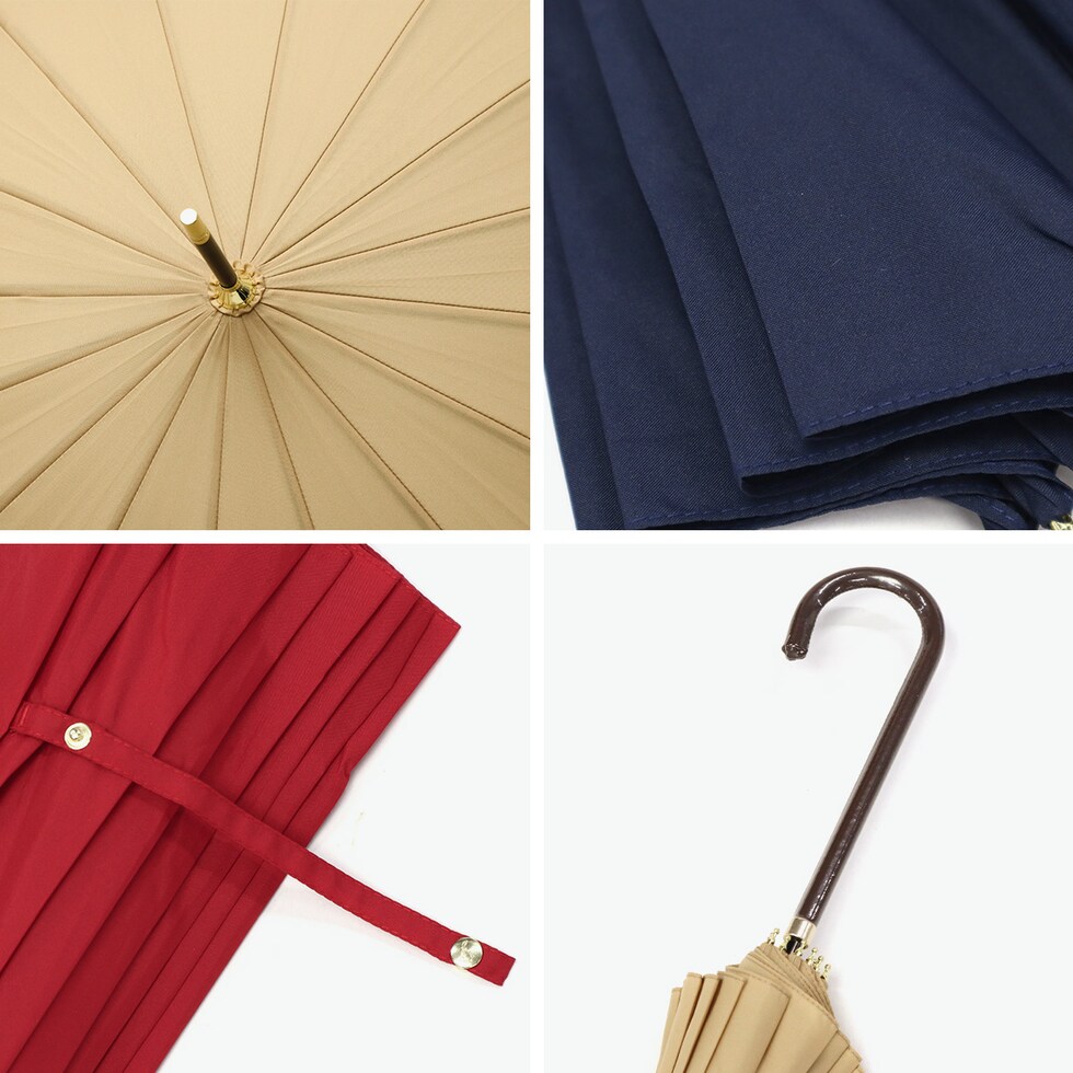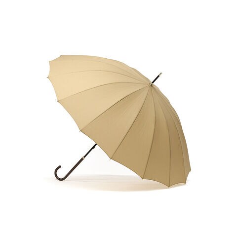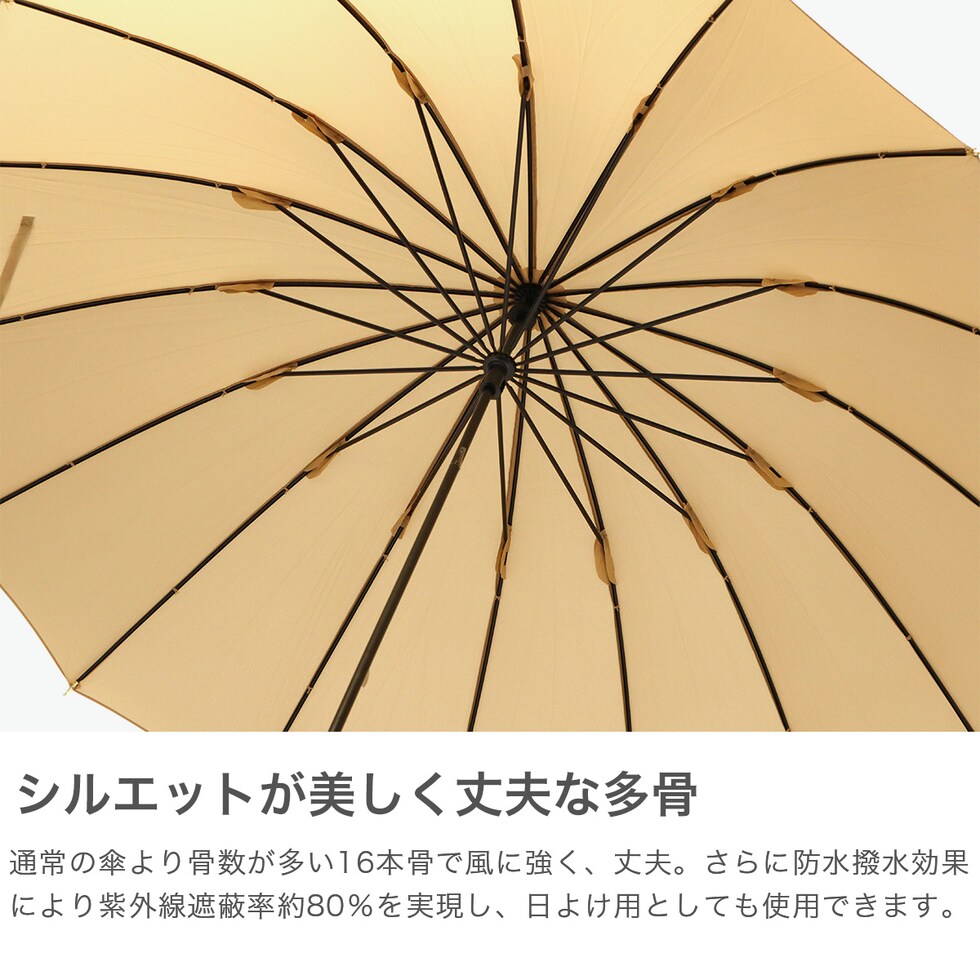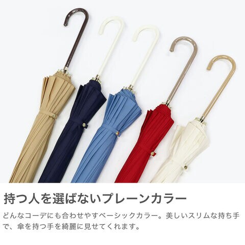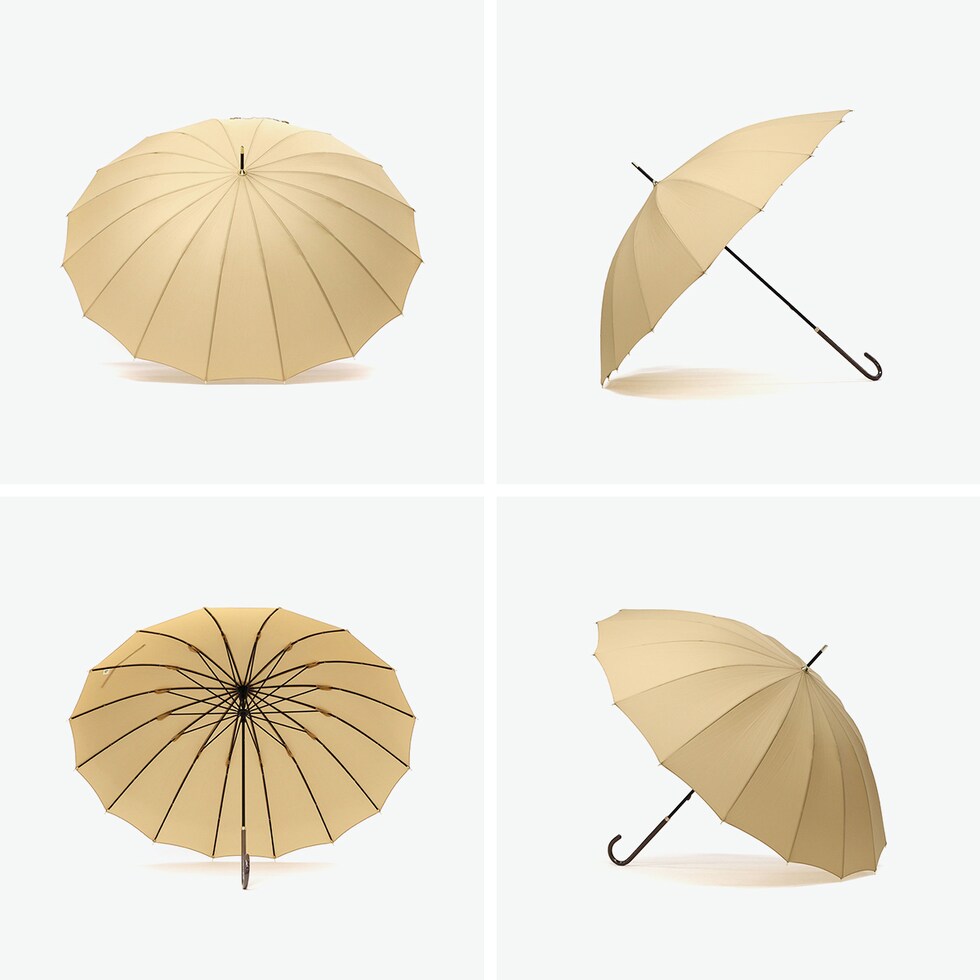 16本骨の安定感と美しさ 人気の16フレームからプレーンカラーが登場。カジュアルにもフォーマルにもマッチする、シンプルな晴雨兼用長傘です。本体は16本骨の骨組みで、手動で開くタイプのモデル。しっかりとした安定感があり、ベーシックカラーでどんなコーデにも合わせやすいデザインとなっています。 |
