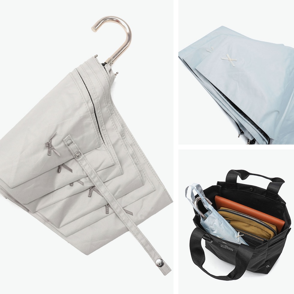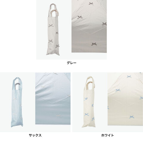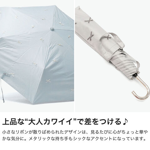 | 繊細なミニリボンで ほどよい甘さをプラス 可憐なリボンモチーフが映える、上品な晴雨兼用折りたたみ傘。遮光率100%・UVカット機能で紫外線や熱をしっかり遮り、日傘としても活躍します。6本骨の安定感ある設計ながら軽量で、コンパクトに持ち運び可能。通勤やお出かけにも最適です。内側の黒コーティングが照り返しを抑え、シンプルながら女性らしさを引き立てるデザインに仕上げました。 |