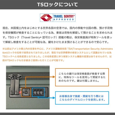 | <購入前にご確認ください> ・メーカーの意向により、付属品の収納袋や箱、製品の仕様やデザインは予告なく変更となる場合がございます。 ・下記による返品・交換はお受けすることができませんので、予めご了承ください。 └ 製品の性質上による細かいキズや塗装ムラ、気泡などがある場合。 └ 配送用の段ボールにキズ、汚れ、破損がある場合。 ・エキスパンダブル機能付きの製品は、マチ拡張時の3辺の和が機内持ち込みサイズ、預け入れ無料サイズを超える場合がございます。また、航空会社や飛行機の機種などによって規定が異なりますので、予めご確認の上お求めください。 ※機内持ち込みサイズ目安表はこちら ・水濡れ(雨・汗など)や日焼けにより、色落ち、退色する恐れがございます。商品のお取り扱いには十分にご注意ください。 ・柄の位置やカラーバランスなどは、生地の裁断や製造過程、素材の特性により画像とは異なる場合がございます。商品をお選びすることはできませんので、予めご了承ください。 ・極力実物に近い色味を再現しておりますが、モニター等の条件により画面上と実物では色味が異なって見える場合がございます。 |