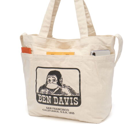 | どんなシーンでも頼れる プリント2WAYトート アメリカを代表するワークブランド『BEN DAVIS/ベンデイビス』のロゴプリントが前面に入ったコットン素材のショルダートートバッグです。A4サイズがゆったり入るサイズ感で、手提げとショルダーの2WAY仕様になっています。フロント部分に配置された3層のポケットが、スマートフォンや小物の収納に便利。ラフに使えるキャンバス素材で、普段使いから通勤・通学にも最適です。 |