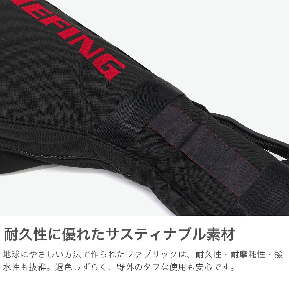 ミリタリズムなデザイン BRIEFING GOLFのテーマである「URBAN GOLF」を体現するベーシックライン、『STANDARD SERIES』のトラベルカバー。アップデートされた本体は、耐久性・撥水性に優れたサスティナブル素材を使用したエコなアイテムになっています。野外でのタフな使用に最適な高強度な仕上がりで、安心してご使用いただけます。ショルダーストラップ付属で斜め掛けができるので、練習場に向かう際などもスマートです。 |