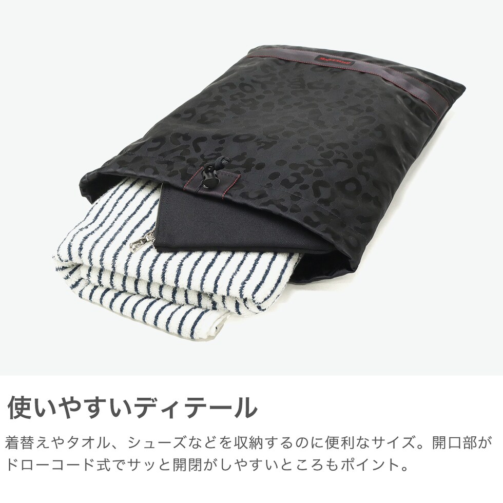 ラグジュアリーなポーチ オリジナルのレオパード柄をジャガード織で表現した、ラグジュアリーな雰囲気漂う『LEOPARD JACQUARD コレクション』のドローコード式ポーチ。耐久性に優れた光沢感ある生地に撥水加工を施し、フィールドでも安心。着替えやタオル、シューズなどを収納するのに便利なちょうどいいサイズ感となっておりユニセックスでお使い頂けるシーズン限定アイテムです。 |