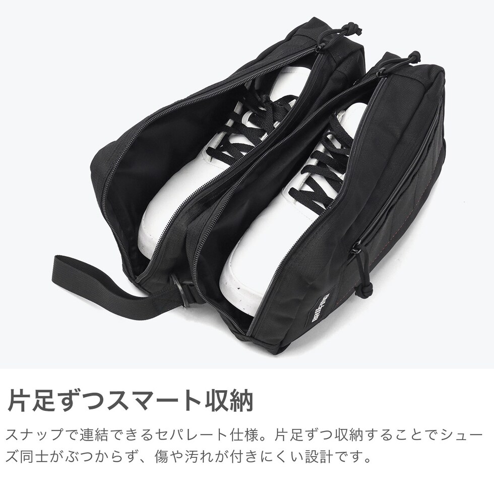 | シューズのことを考えた タフで頼れるケース 耐久性の高い素材やパーツを採用する事でBRIEFINGのヘビーデューティを体現する『PRO SERIES/プロシリーズ』のシューズケース。片足ずつ収納できるセパレート構造で、擦れや汚れをしっかり防止。メイン素材には、軽量で高強度な中空バリスティックナイロンを使用し、タフさと使いやすさを兼ね備えた仕上がりです。 |