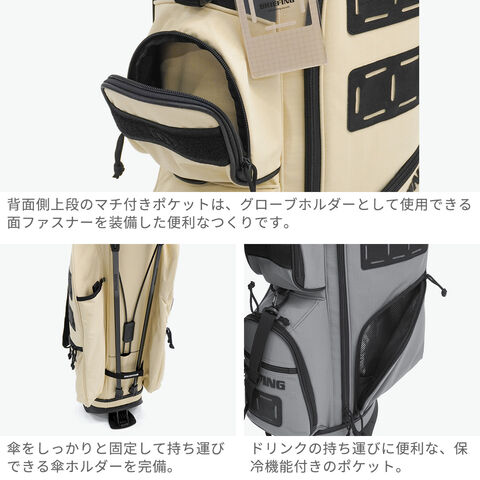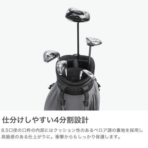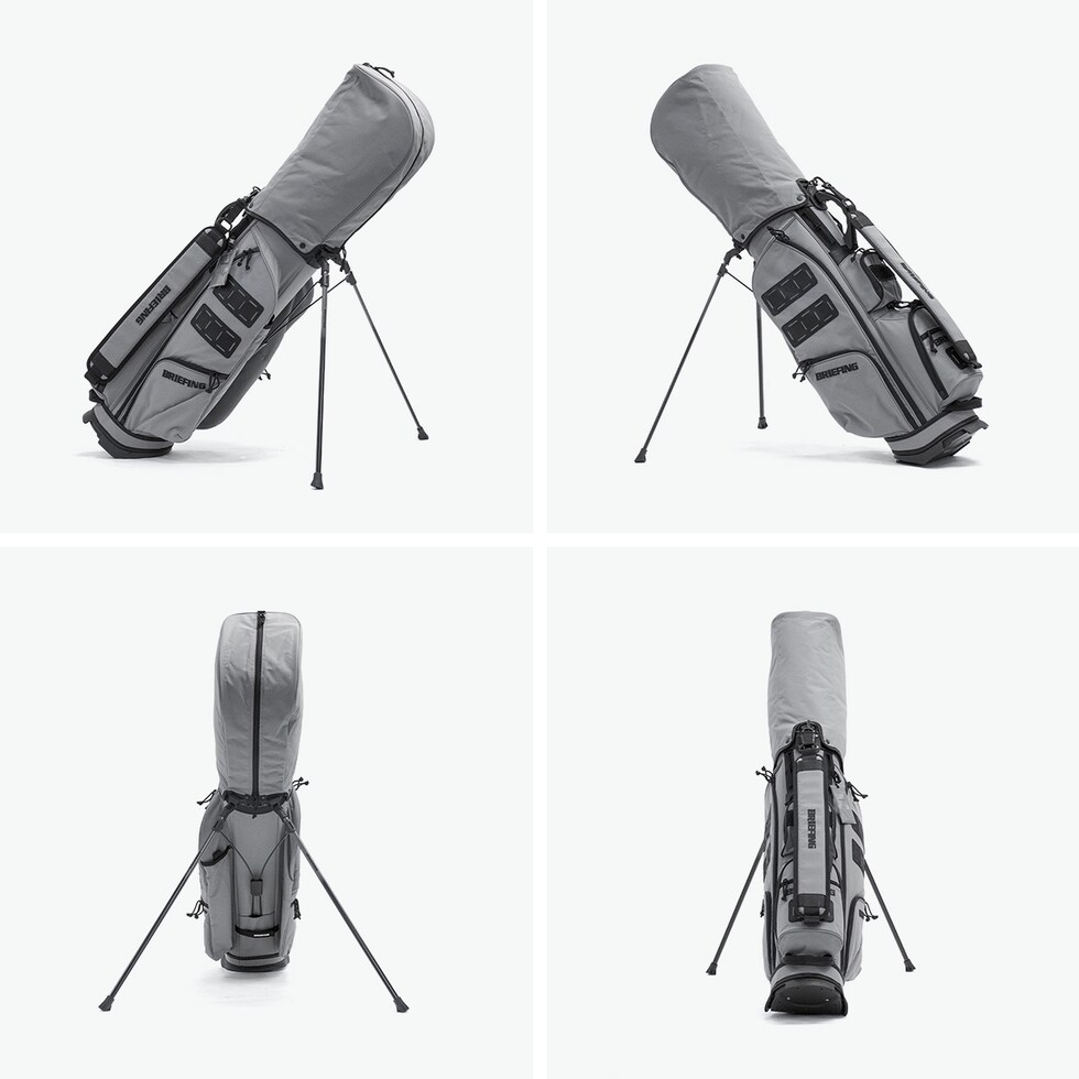軽量コンパクトなボディ 洗練されたデザインとマテリアルを落とし込んだコレクション『DL SERIES』のキャディバッグ。ゴルフ場への行帰りに配慮し、積載する車を選ばないサイジングや収納性能はそのままに、素材のマットな質感がミリタリーイメージを醸し出す、BRIEFINGらしいルックスに仕上げています。 |