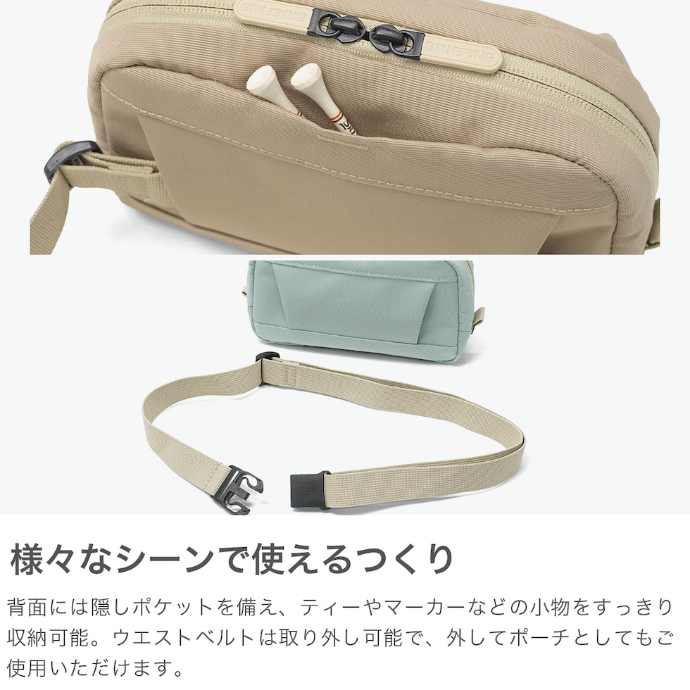 | ポーチとしても使える 便利な2WAY仕様 『BRIEFING GOLF』から、ブランド初の女性ゴルファー向けシリーズが登場。耐久性や実用性はそのままに、女性のプレースタイルに寄り添うカラーリングとサイズバランスを追求しました。ワントーンでまとめたニュートラルカラーが上品で洗練された印象を演出。ストラップを外せばポーチとしても使用可能なのも嬉しいポイント。ラウンド中の動作を妨げない軽やかな設計と、上品な佇まいを両立した『NC SERIES』のウエストポーチです。 |