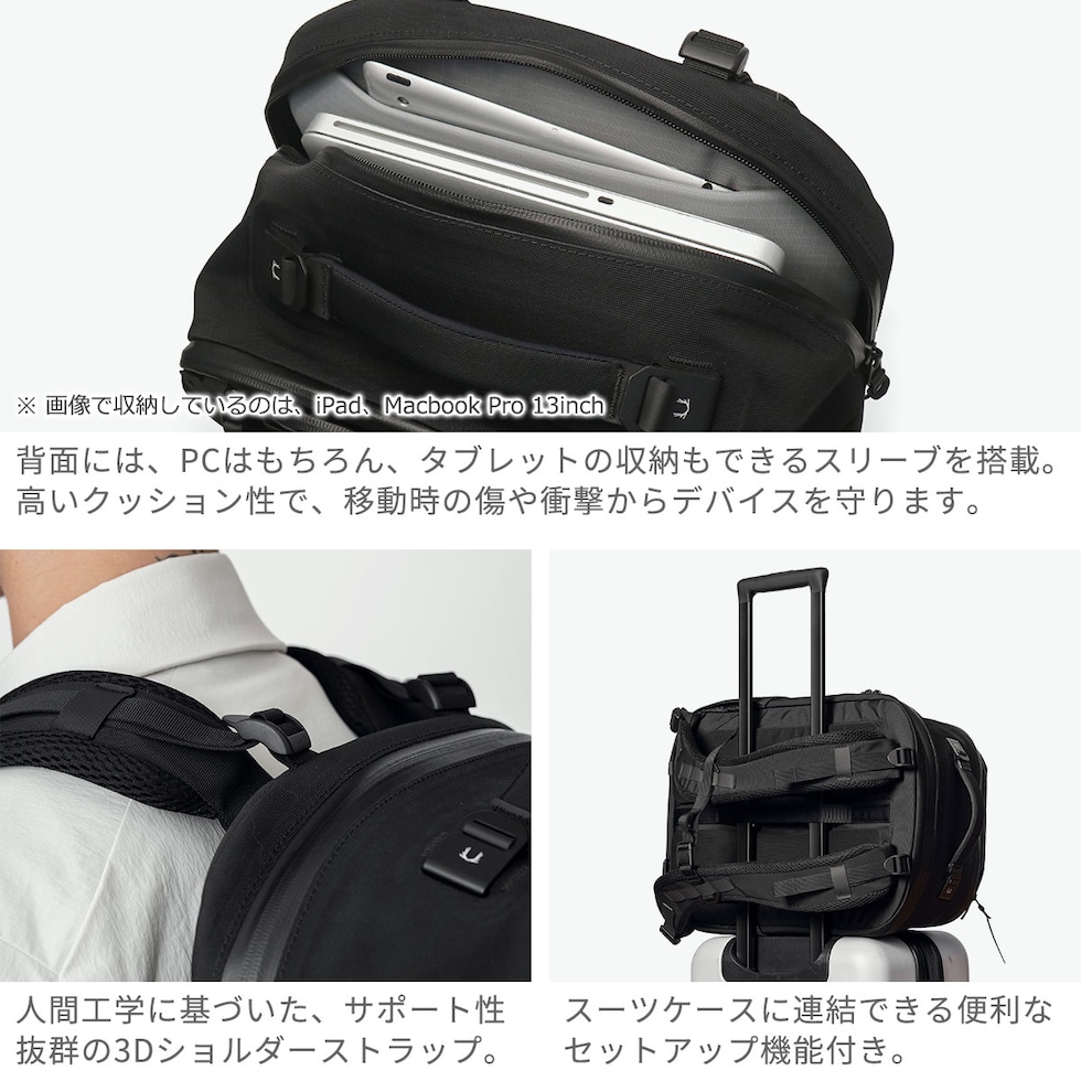 日常をサポート 『CITADEL SERIES』の二ューアイテムで、CITADEL25のハーフジップバージョン『CITADEL H2』。耐摩耗性・防汚性・防塵性に優れている99%防水の高密度ナイロンの独自素材EmberTexが採用され、バッグの形状を保持し、自立しやすいつくり。通気性の高いバックパネルと、人間工学に基づいた3Dストラップは2種類のEVAフォームを使用し、クッション性とサポート性を両立。快適でスマートなデザインでユニセックスでお使いいただけるアイテムとなっています。 |
