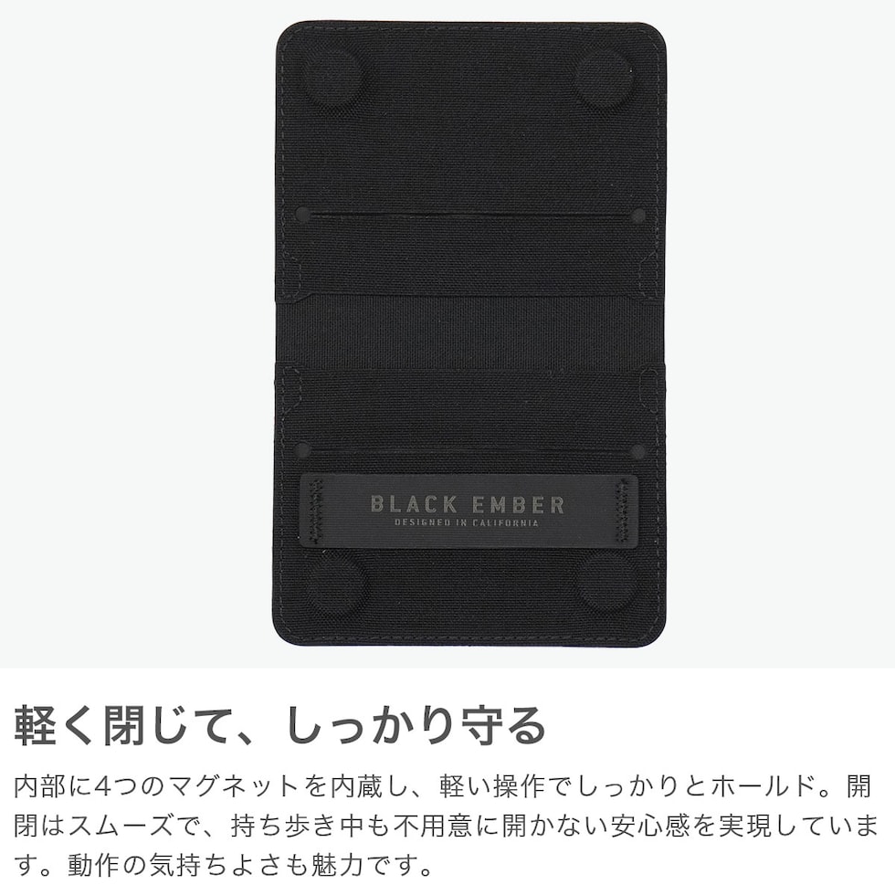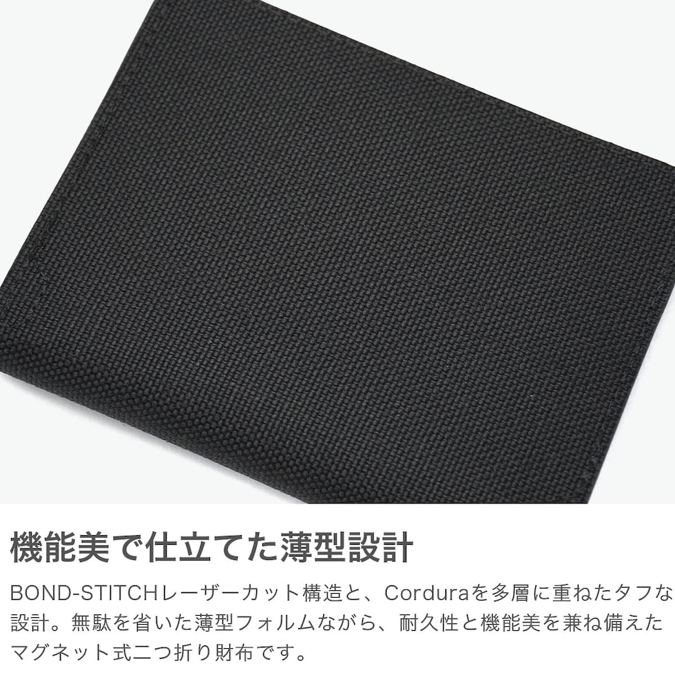 ミニマルウォレット OND-STITCHレーザーカット構造を採用し、Cordura素材を多層に重ね合わせたミニマムなマグネット式二つ折り財布です。チップ+ピンカード用に設計されており、4つのマグネットが埋め込まれ、簡単なクリックでしっかりと閉じられます。ユニセックスでお使いいただけるシンプルでスマートなアイテムとなっています。 |