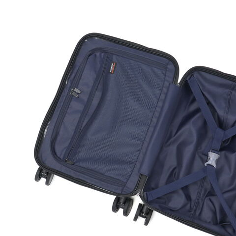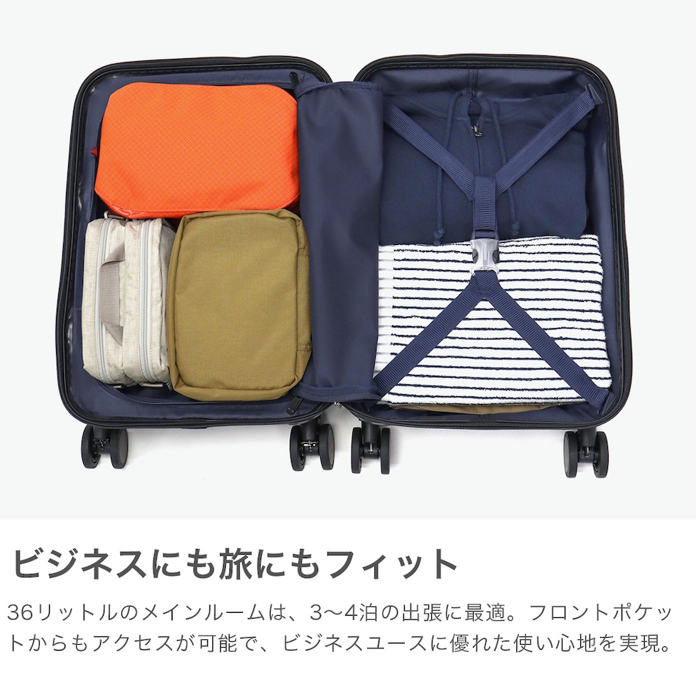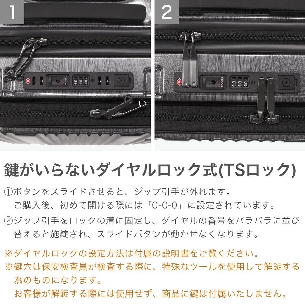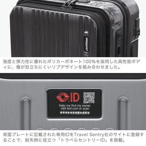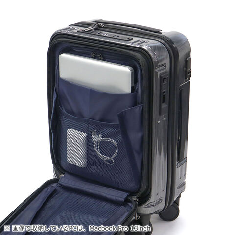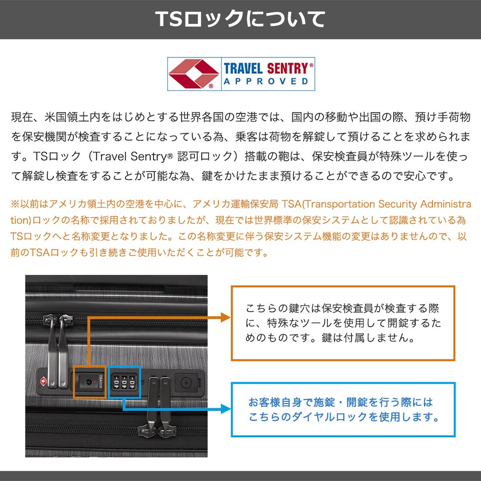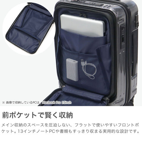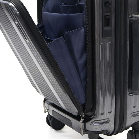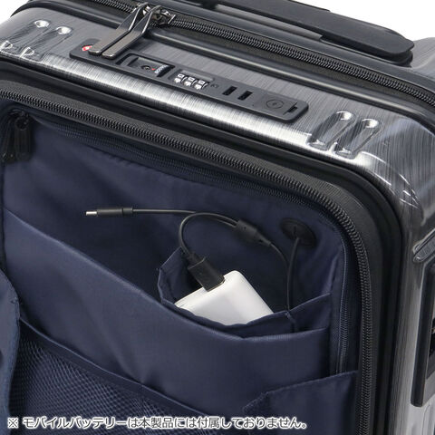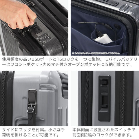 | 旅も仕事もスマートに 充実装備のキャリー 洗練されたフォルムに多機能を凝縮したスーツケースです。PC収納やUSBポート、吊り下げ式インナーボードを備えたフロントオープン設計で出張も旅行も快適。TRAVEL SENTRY ID付きで、移動の多いビジネスパーソンにも安心の一台です。 |