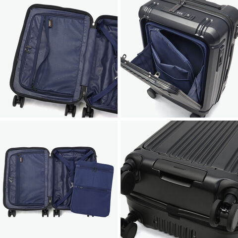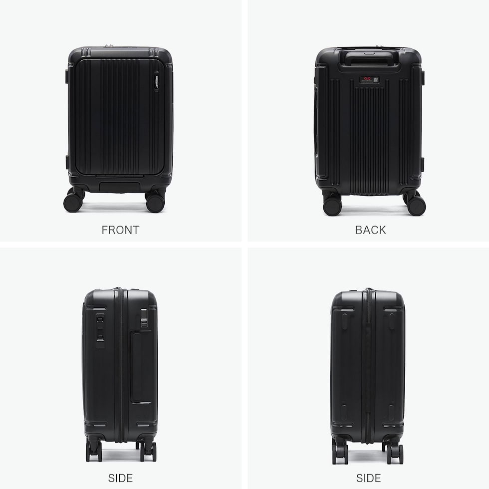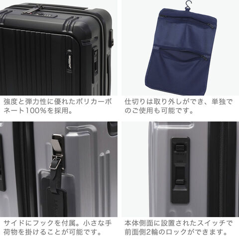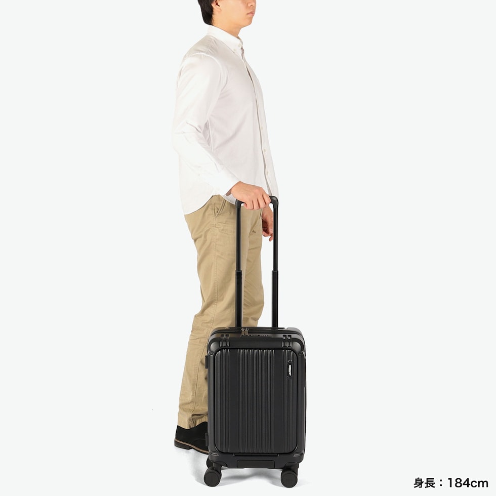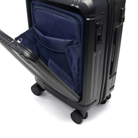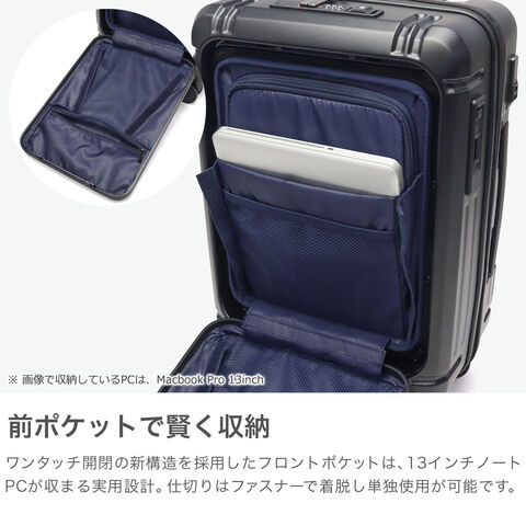 | 理想の旅を支える ワンタッチ開閉キャリー 細部まで利便性を追求したフロントオープンキャリー。ワンタッチで開閉できる新機構のフロントパネルにより、立ったままでPCや書類を即座に出し入れ可能です。静音性に優れた大径キャスターや簡単に操作できるストッパー、紛失対策のID機能など、ストレスフリーな設計が魅力。ホテルで吊るして使えるインナーボードも完備し、ビジネスから旅行まで、あらゆる移動を快適かつ安全にサポートします。 |