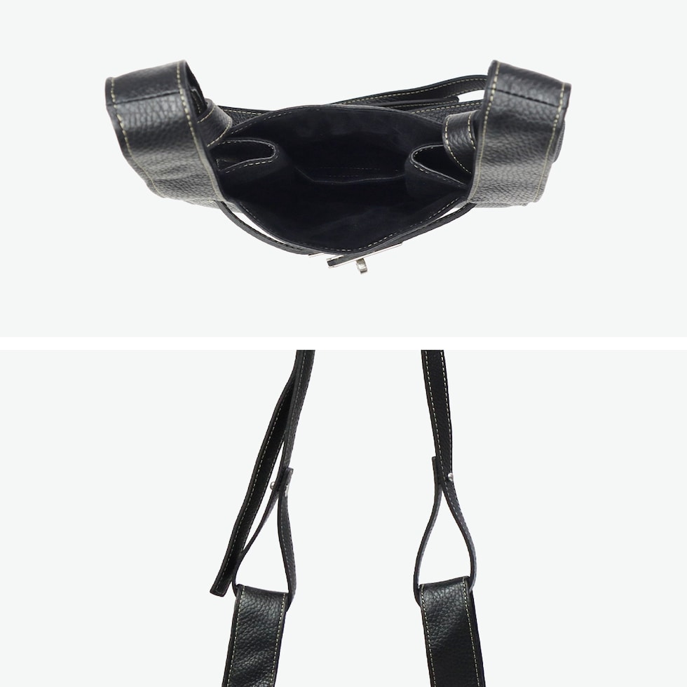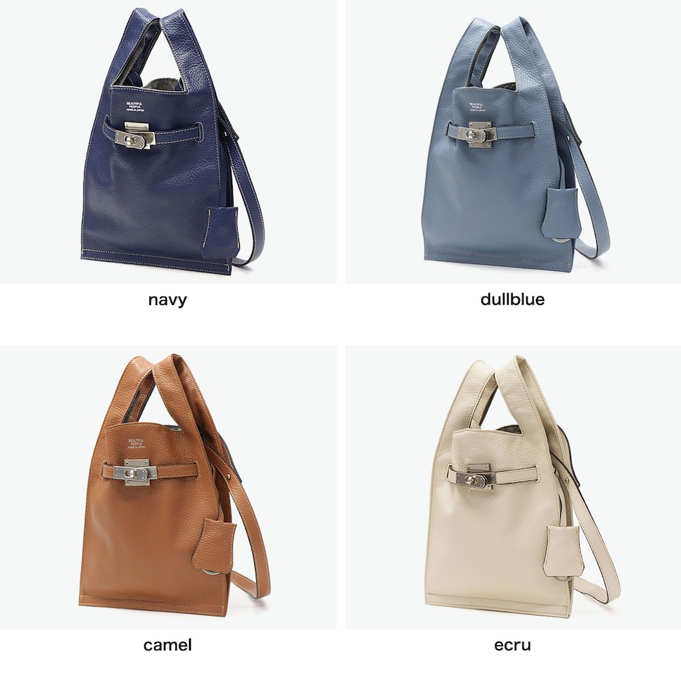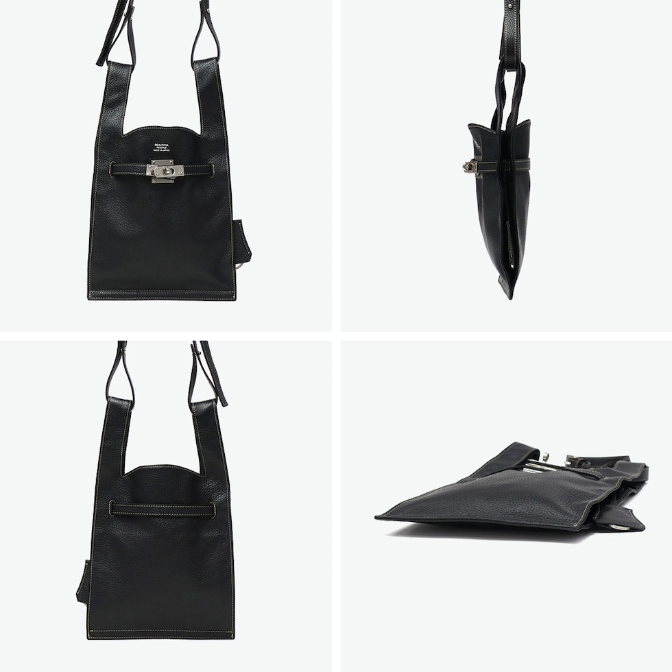 ショルダートート イタリア製シュリンクレザーを使用した2WAYショルダーバッグ。マーケットバッグと金具の組み合わせが特徴で、「高価」と「安価」、「理想」と「現実」など相反する要素を融合したデザインに仕上がっています。付属のチャームはキーリングとしても使用可能。裏地には手触りの良い起毛ポリエステルを採用し、使い心地も快適です。 |