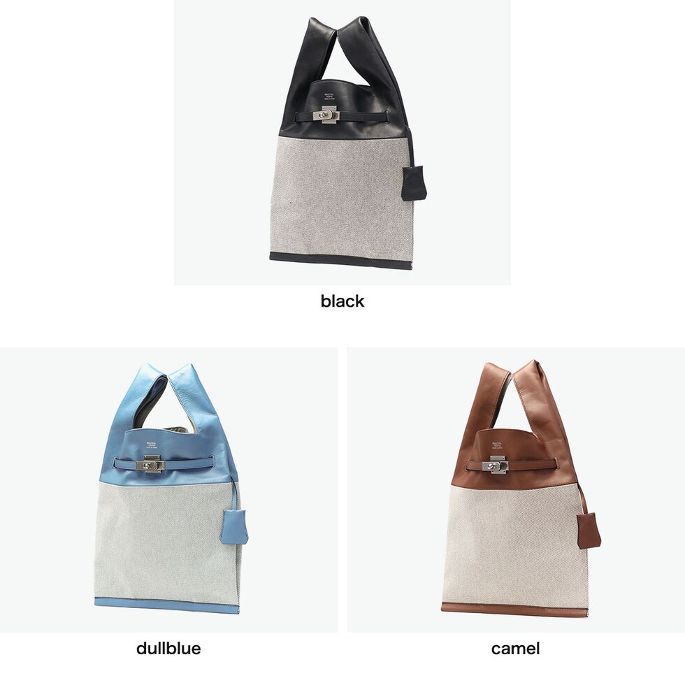 きれいめトート 上質な牛革とカジュアルなコットンを組み合わせたトートバッグ。マーケットバッグと金具の組み合わせが特徴で、「高価」と「安価」、「理想」と「現実」など相反する要素を融合したデザインに仕上がっています。付属のチャームはキーリングとしても使用可能。裏地には手触りの良い起毛ポリエステルを採用し、使い心地も快適です。 |