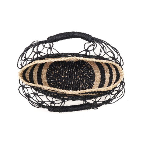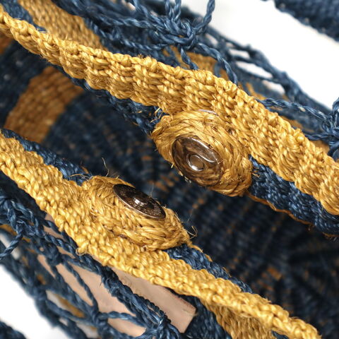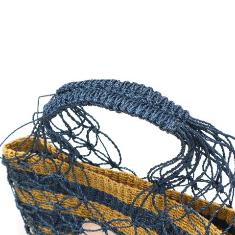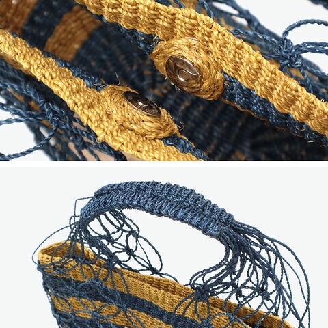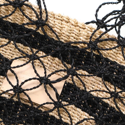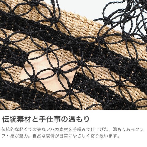 主役級のかごバッグ いつものスタイルにさりげないアクセントを添える、大人可愛いかごバッグ。ボーダー柄に編まれた横長のバスケットを、メッシュ状に編んだトートバッグで包み込んだような二重構造がポイントです。オリジナルで染めたアバカを使用し、温もりを感じさせながらも、涼しげで軽やかな印象に仕上げました。 |