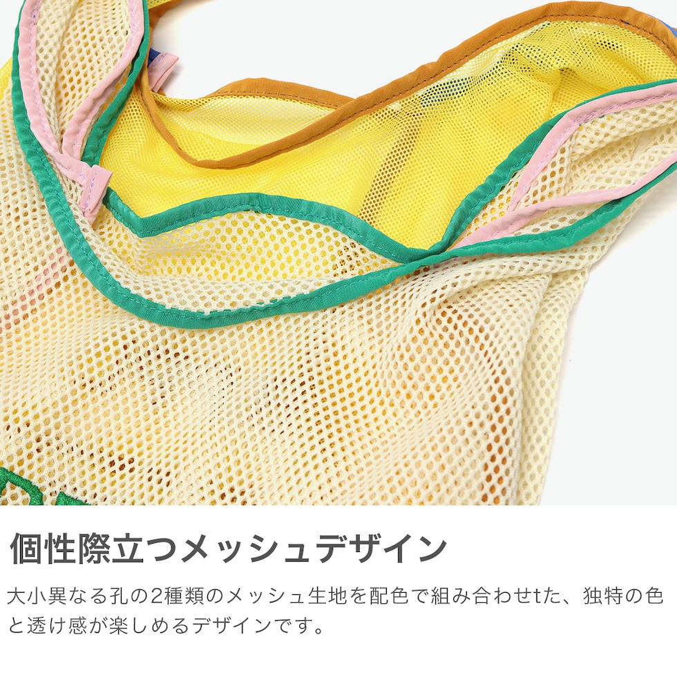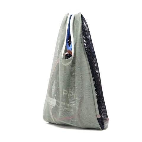 個性派エコバッグ ランチボックスポリバッグを繋げたメッシュバッグ。2ルーム仕様と2重のバッグ、両方のかたちを楽しめる個性的なつくりが魅力です。メッシュ独特の透け感や配色テープを使ったこだわりのディテールなど、日常を彩るユニークなデザインを楽しめるアイテムとなっています。 |