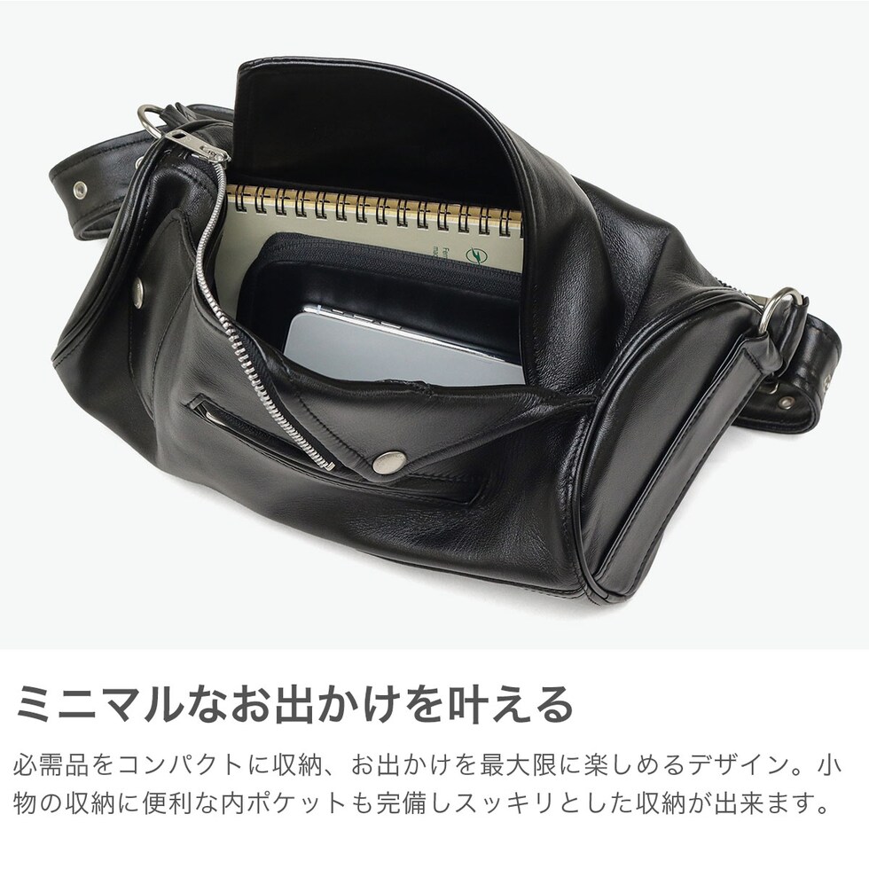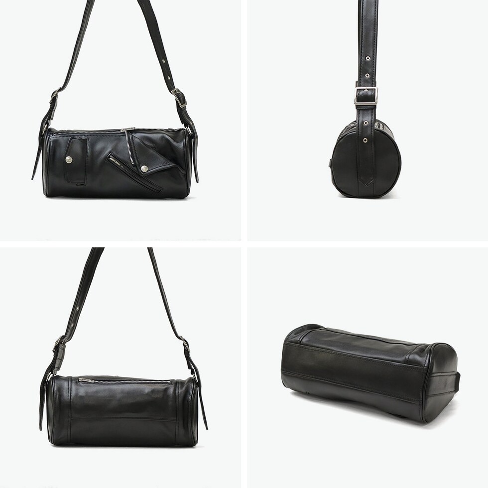 ライダース風ショルダー ライダースジャケットのディテールを抜粋し、個性的なシリンダー型に落とし込んだショルダーバッグ。素材にはヴィンテージライダースと同様の高品質な羊革を使用し、ハリと艶を兼ね備えた上品な仕上がりになっています。オリジナルのファスナー引手を使用するなど、細部にまでこだわったデザインが魅力です。 |