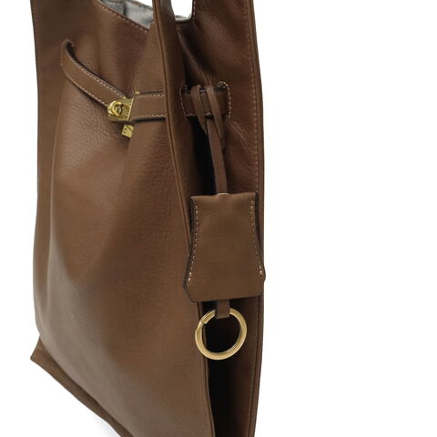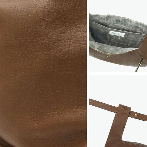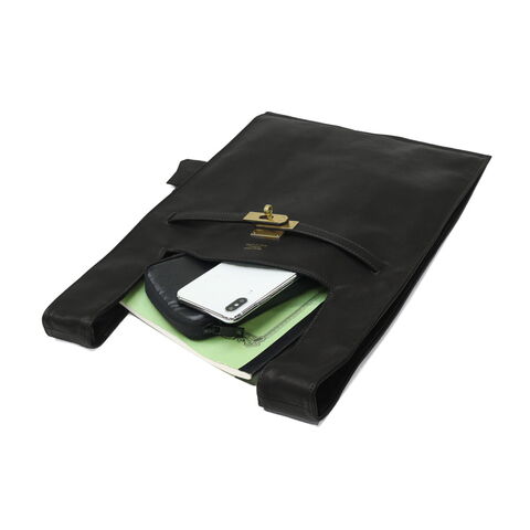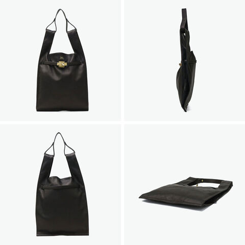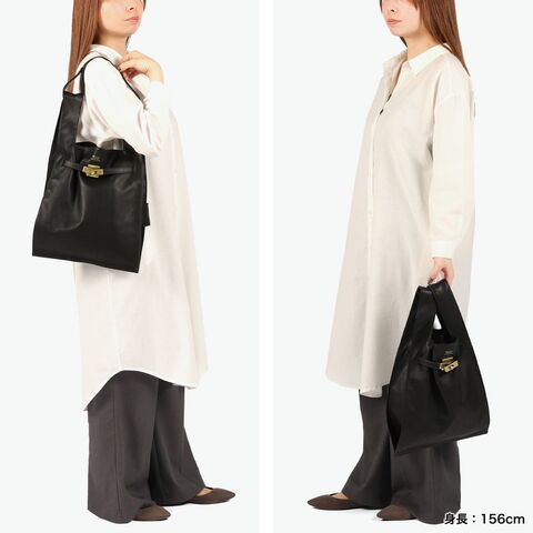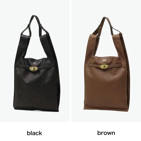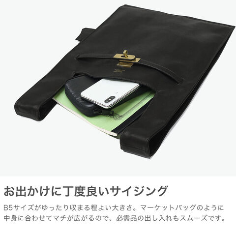 ソフトなレザーと真鍮色の金具を使用したユーズド感のあるトートバッグ。素材には、なめしの工程で2度オイルを染み込ませた牛革を使用し、使うほどにやわらかな風合いと深みが増していきます。B5サイズがゆったりおさまる大きさで、手荷物をしっかり収納可能。生活になじみのあるマーケットバッグを高級感のある素材で仕立て直すことで、新しさと遊び心を感じられるアイテムに仕上がっています。