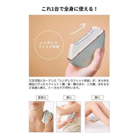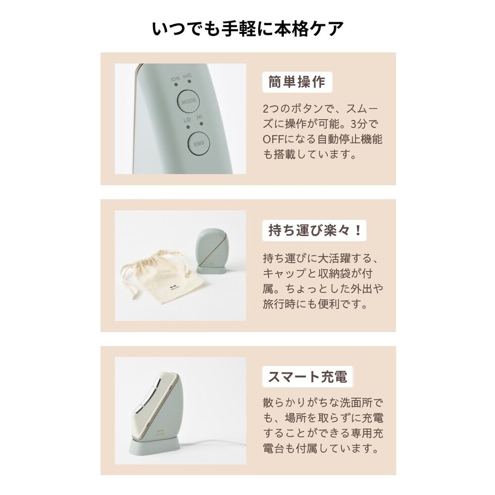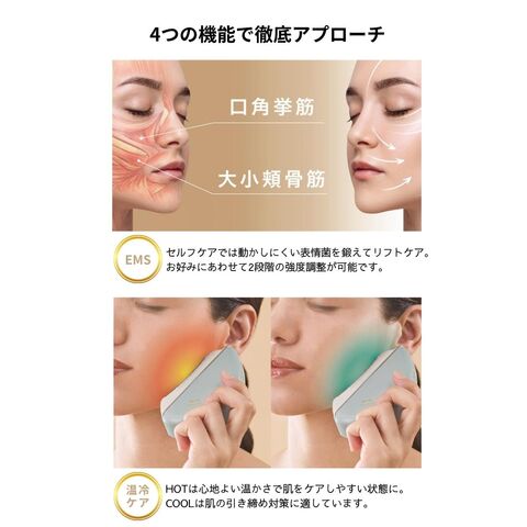 | 肌も気分も 上向くルーティン これ一台で顔から全身ケアがかなう温冷EMS美顔器。表情筋を刺激してハリを高め、イオン導入で美容成分を角層まで届けます。温冷ケアで肌を心地よく引き締め、カーブ形状が顔・二の腕・脚にフィット。3分自動オフ機能付きで、毎日に手軽な美容習慣をプラスします。 |