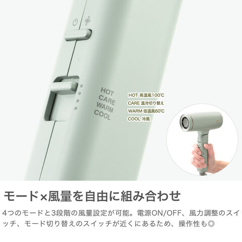 | 仕様 | <電源> 電源:AC100V 50/60Hz 消費電力:1200W <電源電源コード> 約 2m <温風温度> 約 100℃(HOTモード/風量(強)) <4モード搭載> HOT/CARE/WARM/COOL <機能> 風量3段階調節、マイナスイオン機能、モード機能 <付属品> 専用ノズル、収納袋、取扱説明書(保証書含む) |