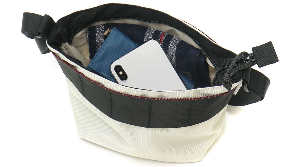 収納部はスマホやポーチ、コンパクト財布などの普段持ち歩くアイテムを持ち歩く際にちょうどいいサイズ感。小ぶりながらしっかりと設けられたマチ幅で、見た目以上の収納力を発揮します。また、内部には細かなアイテムの仕分けに便利なポケットを1ケ設けています。