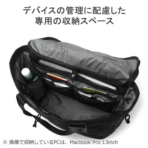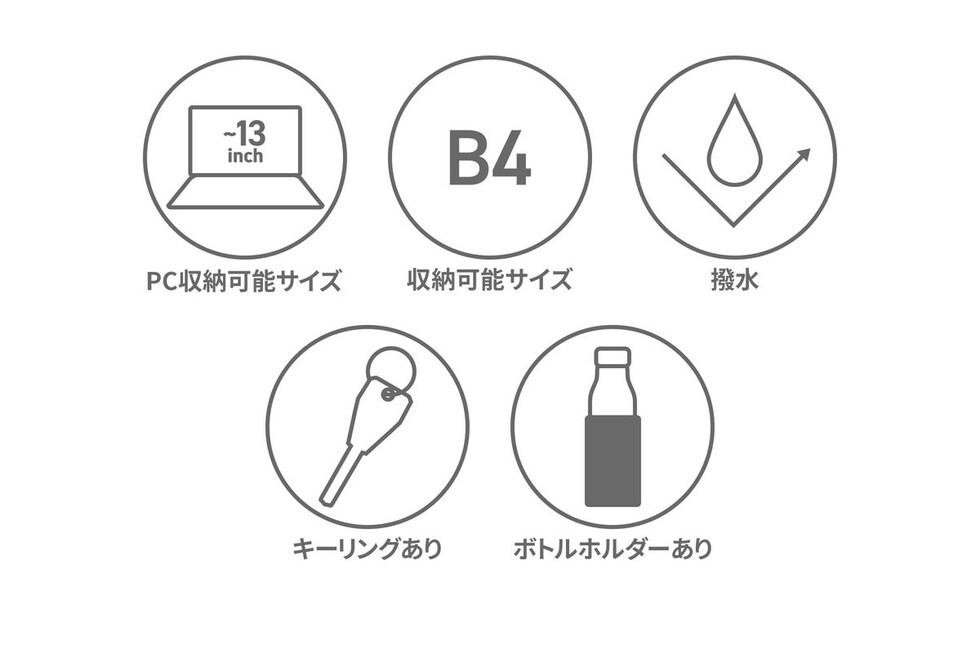 | 仕様 | <外側> ジップポケット(M)×1 ジップポケット(S)×2 ジップポケット(XS)×1 <内側> PC収納×1 ジップポケット(L)×1 ポケット(M)×3 メッシュジップポケット(M)×3 ポケット(XS)×2 ボトルホルダー×2 キーホルダー×1(取り外し可能) |