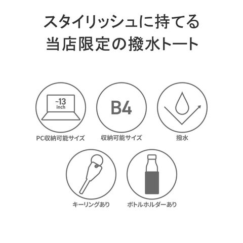 水に強い機能性と、スタイリッシュな顔立ちを併せ持つトート。こちらは当店でしか手に入らない限定モデルです。本体には撥水素材を使用し、裏使いのファスナーを採用しているため、生活防水に対応します。B4サイズの広々とした収納部には、PC収納や豊富なポケットを設け実用性の高い設計に。収納口にはファスナーがついているので、荷物が飛び出す心配もありません。内装カラーにはスタイリッシュかつ内部の視認性に優れたグレーを採用しているのもポイントです。