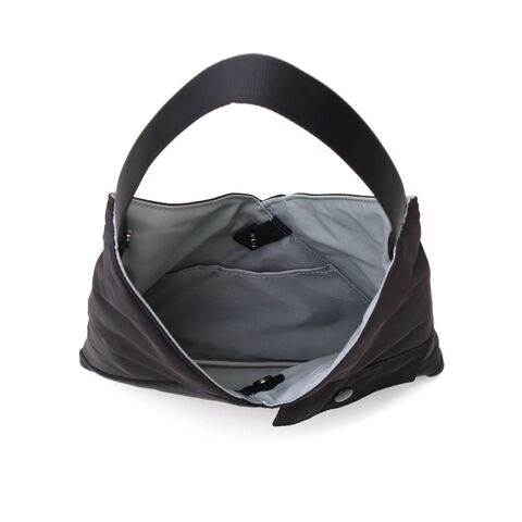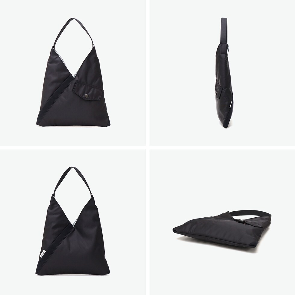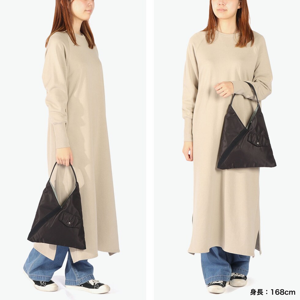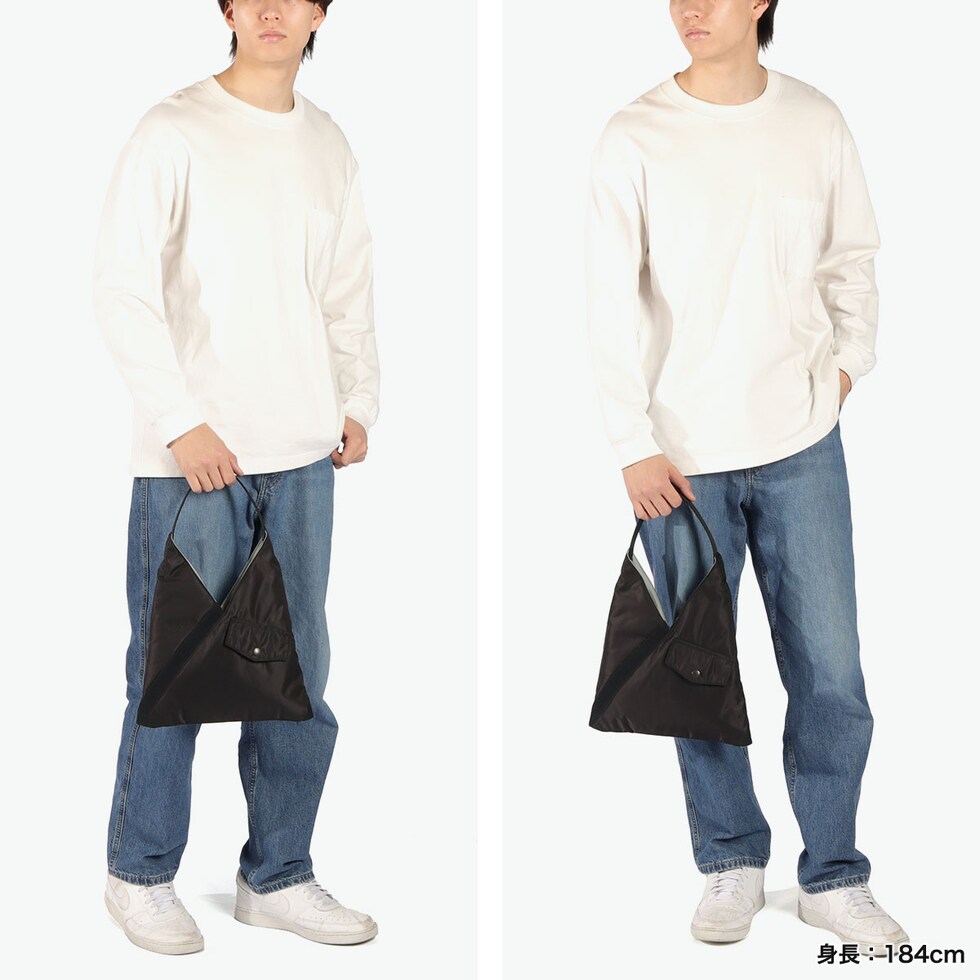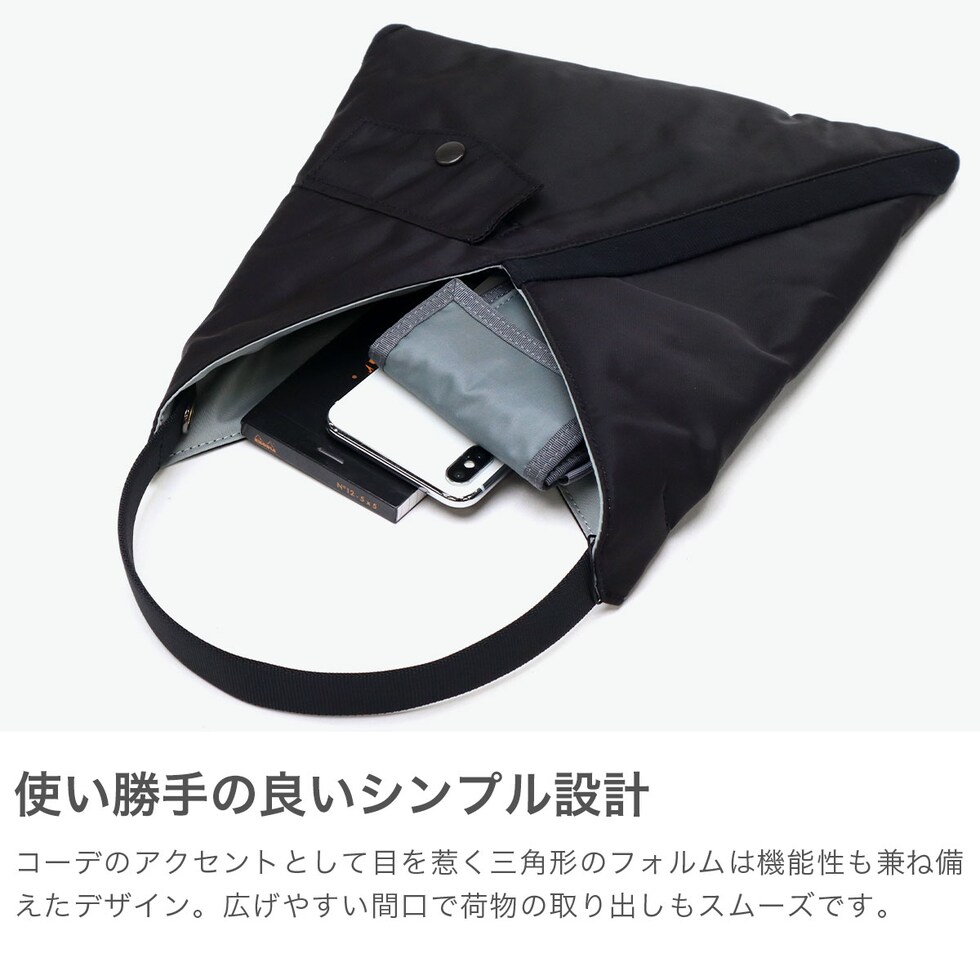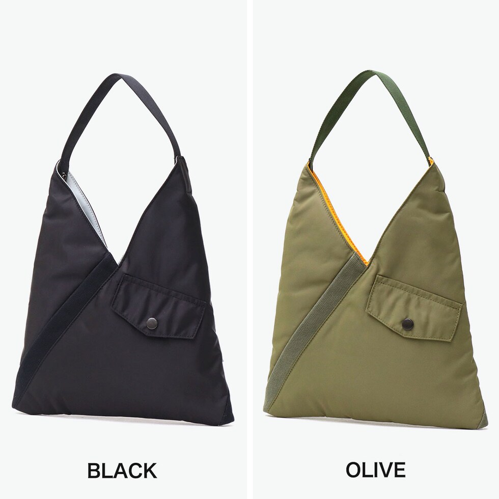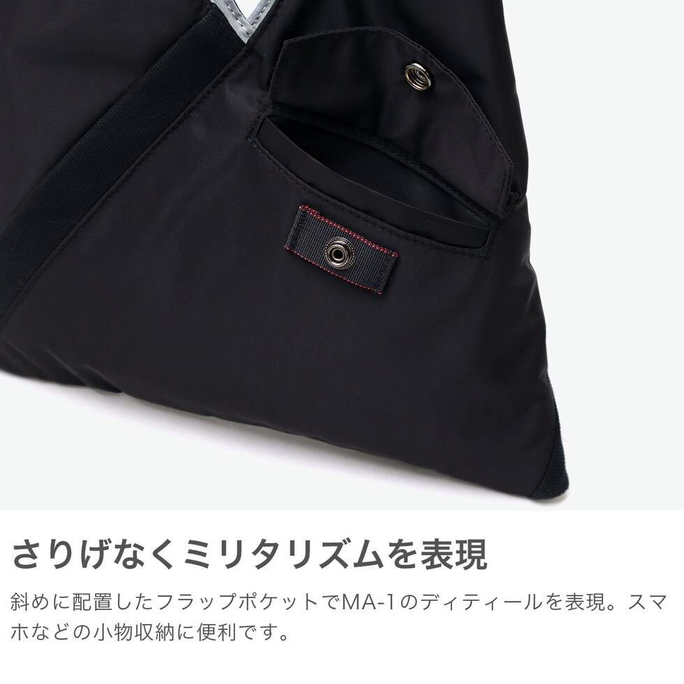 | 日常に溶け込む ミリタリースタイル ミリタリーを代表するアイテムMA-1 JACKETから着想を得てデザインされた『TILT COLLECTION』。こちらは、斜めに配置されたリブやフラップポケットなどでディテールを表現したトライアングルトートSです。ハンドル部分に配置されたスナップボタンを留めると、形を変えて使用することができます。 |
