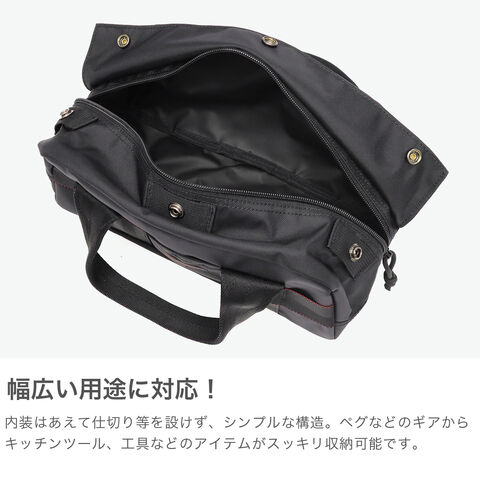 アウトドアで使用するツールの持ち運びや保管に最適な、小型のボストンバッグ。内装はあえて仕切り等を設けずシンプルにすることで、ペグなどのギアからキッチンツール、工具など幅広い用途に対応が可能に。軽量かつ撥水加工を施した素材で、普段使いのバッグとしてもお使いいただけます。