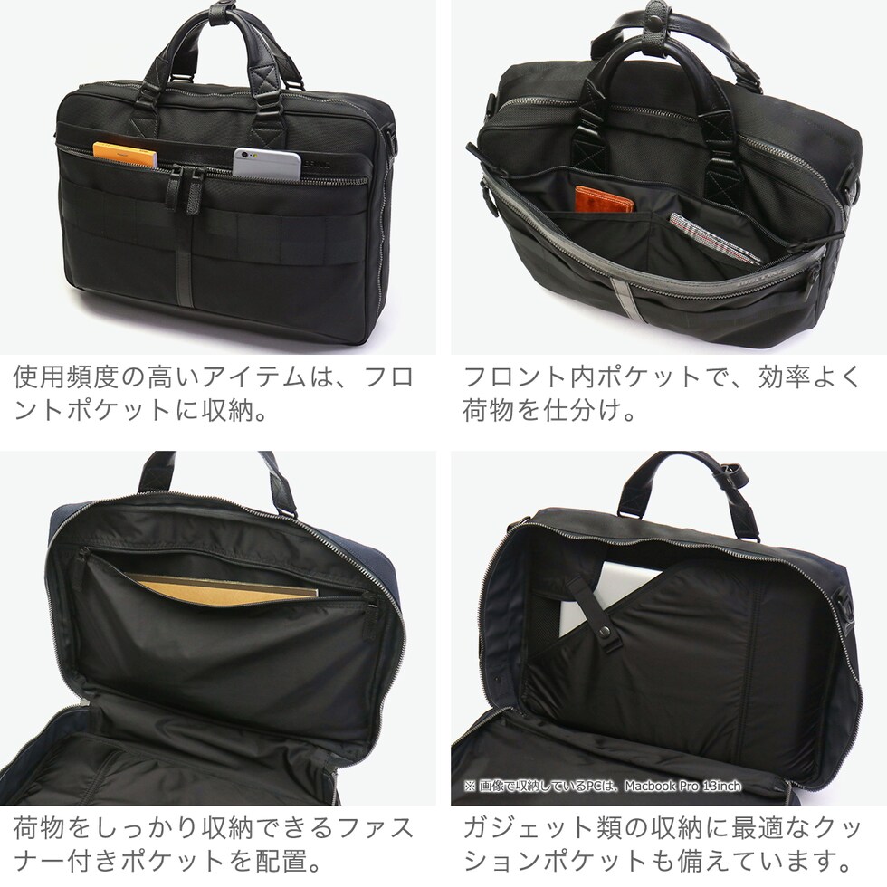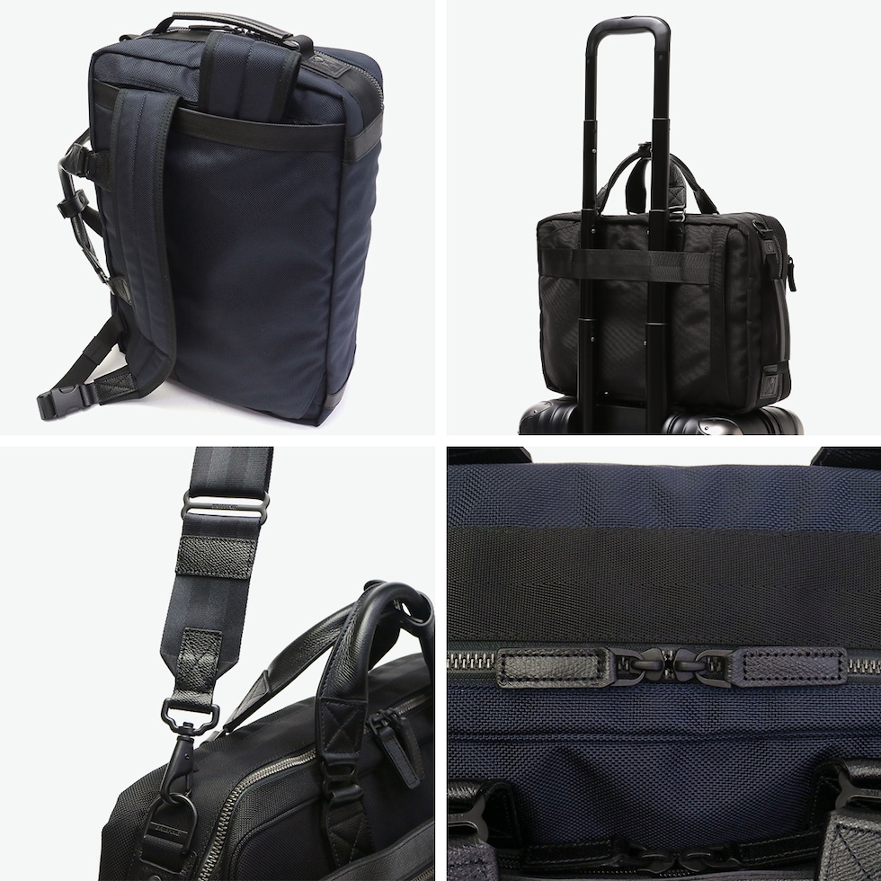 | 選べる3通り 通勤に自在性 ブランドの象徴であるレッドラインをあえて使わず、ワントーンでまとめたデザインがシックな顔立ちを表現する「FUSION COLLECITION」の3WAYブリーフケース。A4対応のメイン収納部は180°開閉で出し入れがスムーズです。クッション付きPCポケットやジップポケットも備え、ビジネスにふさわしい高機能を搭載。ウォータープルーフ加工のレザーと高強度ナイロンのコンビが、都会的で洗練された印象を際立たせます。 |