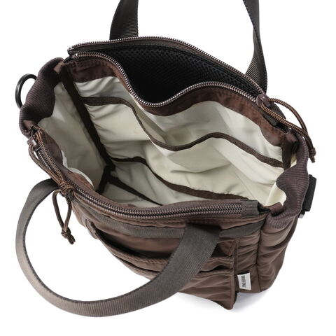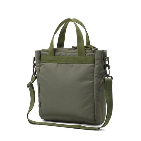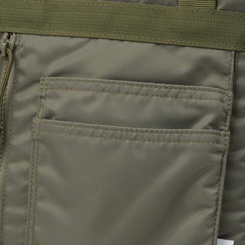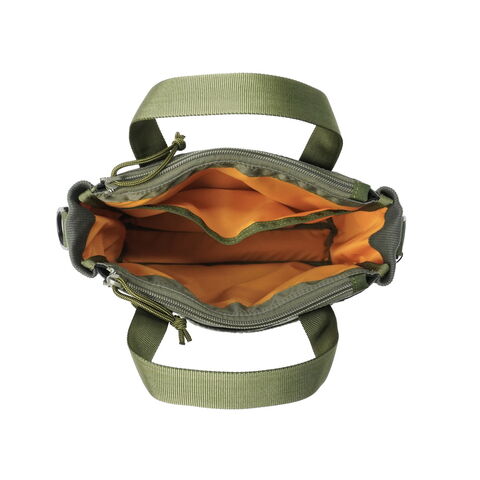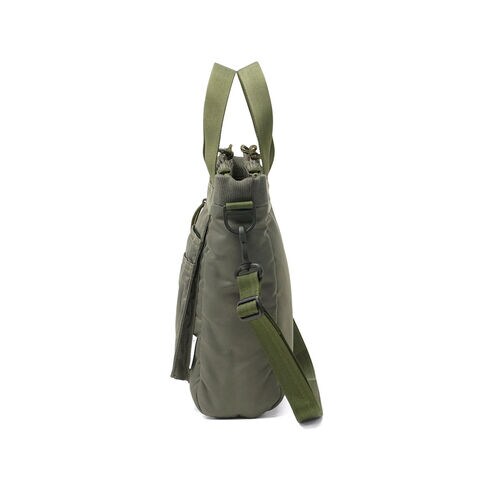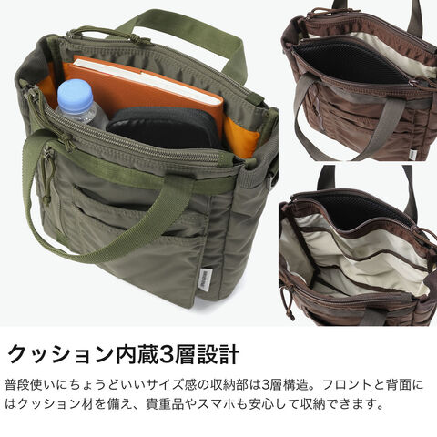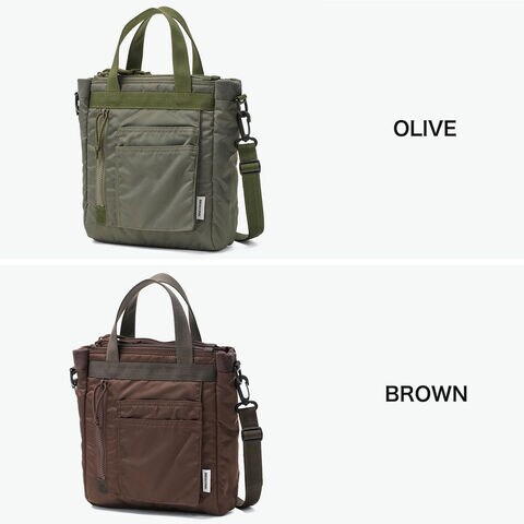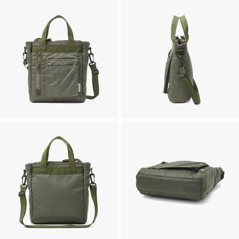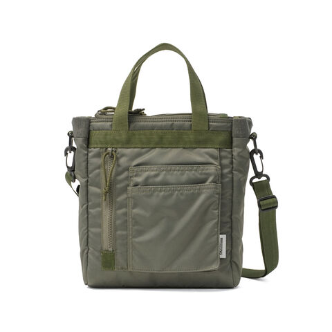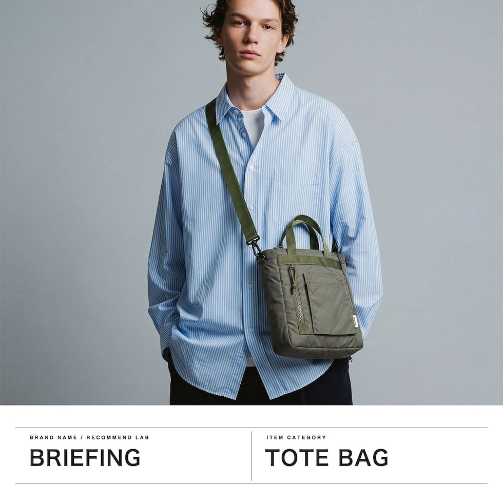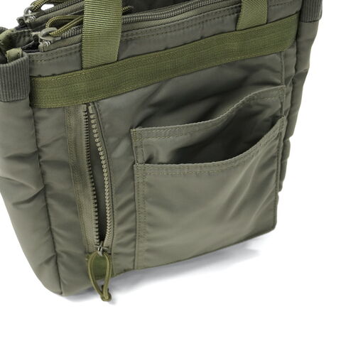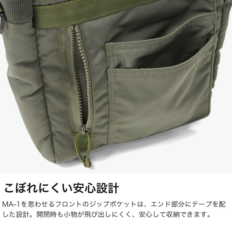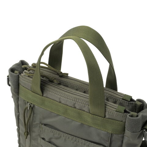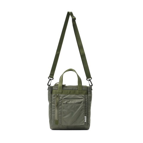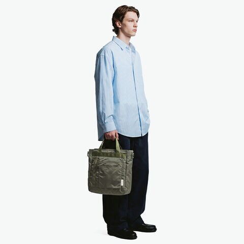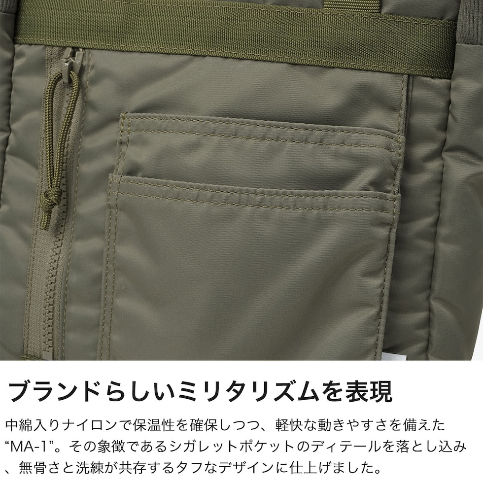 ミリタリーバッグ MA-1ジャケットの腕にあるユーティリティポケットのデザインを落とし込み、ブランドらしいミリタリズムを感じさせるルックスに仕立てた『FIME COLLECTION』の2WAYトートバッグ。C0撥水加工を施した環境に配慮したリサイクルナイロンと、ボンディング加工のコットン素材を組み合わせ、ほどよい厚みと柔らかな膨らみを実現。3層構造でフロントと背面にはクッション入りの収納を備え、スマホやタブレットも安心して持ち運ぶことができます。ショルダーは取り外し可能で、手提げや肩掛け、斜め掛けと自由に持ち方を変えられ、日常使いからアウトドアシーンまで幅広く活躍してくれます。 |