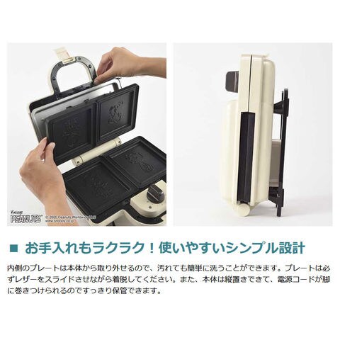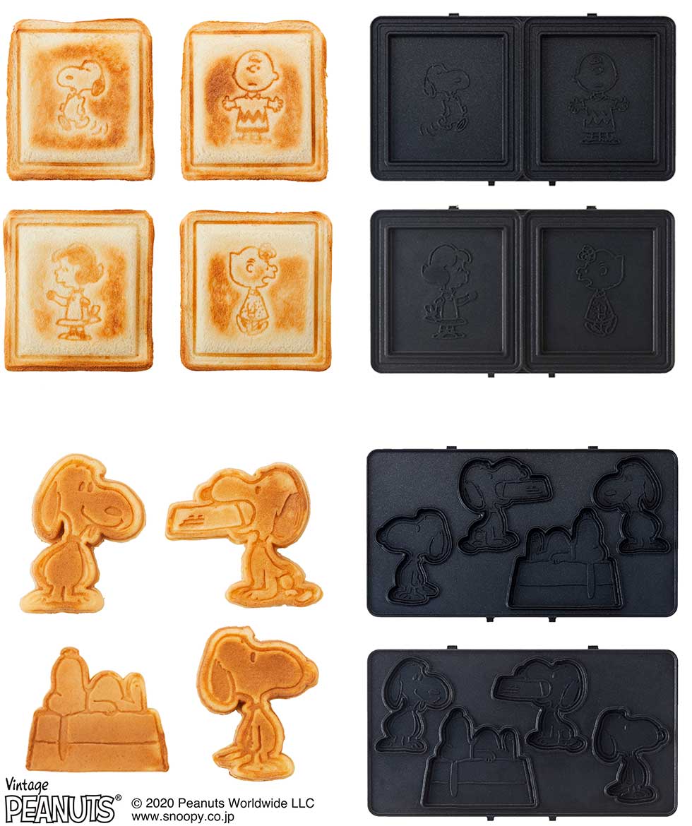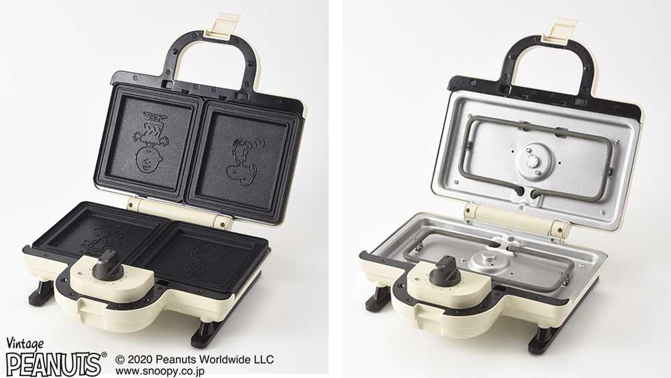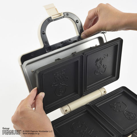 大人気のホットサンドメーカーに、PEANUTSシリーズが仲間入り。PEANUTSキャラクターの焼き目が付いたホットサンドが作れます。上下にスヌーピーとチャーリー・ブラウンの焼き目がつけられるプレートが付属します。さらに、スヌーピーの人形焼きが作れるスヌーピープレート付きです。