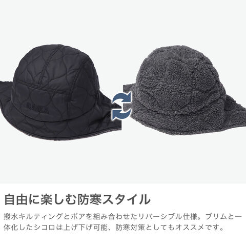 カジュアルスタイル 撥水加工のキルティング生地とボアを組み合わせた、リバーシブル仕様のハット。ブリムと一体化したシコロは上げ下げが可能です◎。防寒対策としてもオススメのユニセックスアイテムになっています。 |