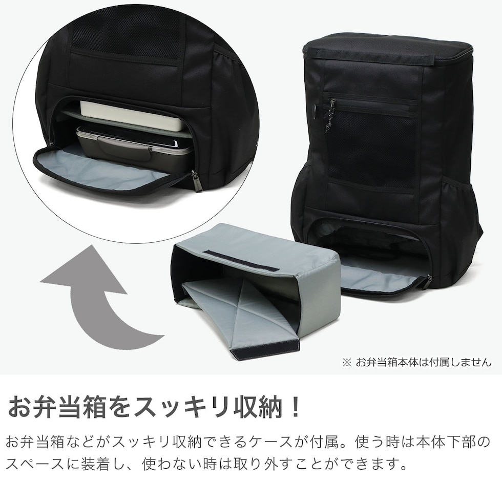 可変式バックパック 現役学生の意見を取り入れて開発した学生向けバックパック。背負いやすいスクエアフォルムで、荷物に応じて可変できる2ルーム仕様。お弁当などを入れるのに便利な、取り外し可能なインナーケースを完備。インナーケースを外して1ルームにすれば、B4サイズがすっぽり入る大容量なアイテムとしてご使用いただけます。 |