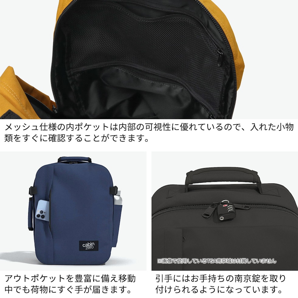 タフな2WAYデザイン イギリス発のトラベルバッグブランド『CABINZERO』から、あらゆる旅先に溶け込むタフなデザインの2WAYバックパックが登場。機内持ち込み対応のコンパクトな設計ながら、PC収納やボトルポケットを備え、移動をスマートに支えます。耐摩耗性に優れた防水生地と最高品質のYKKファスナーを採用し、高い耐久性で安心感をプラス。南京錠などで施錠できるキーロックホールや、世界最大手荷物捜査システム「OKOBAN」も付いており、セキュリティ面も考慮しています。 |