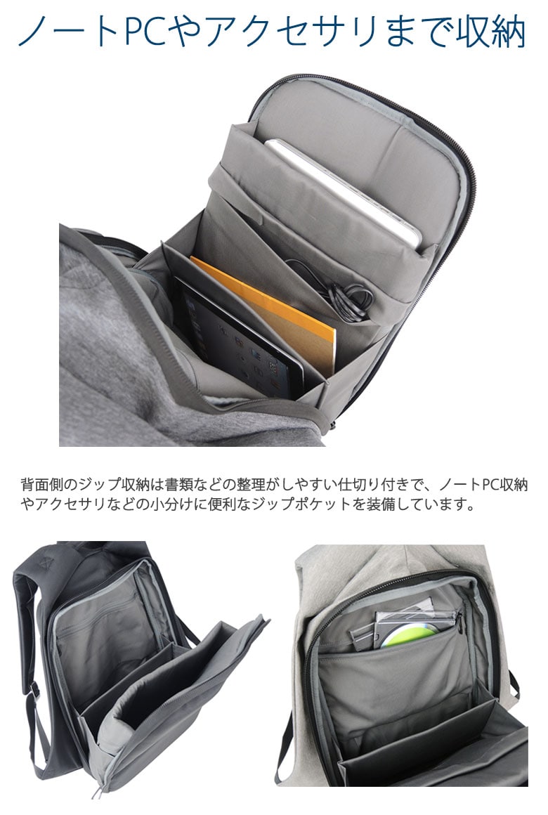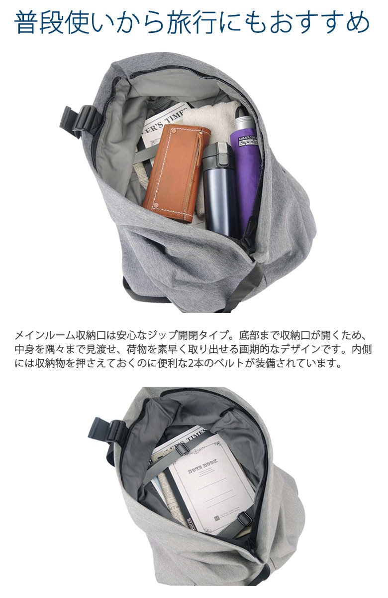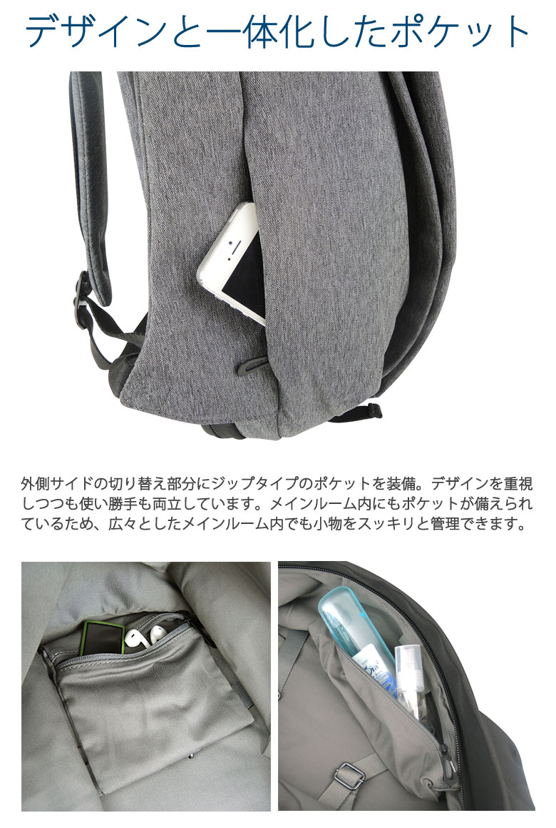 | 【内側】 | ・PC収納(15インチ対応)×1 ・ポケット(M)×1 ・ジップポケット(M)×2 ・ジップポケット(S)×1 |